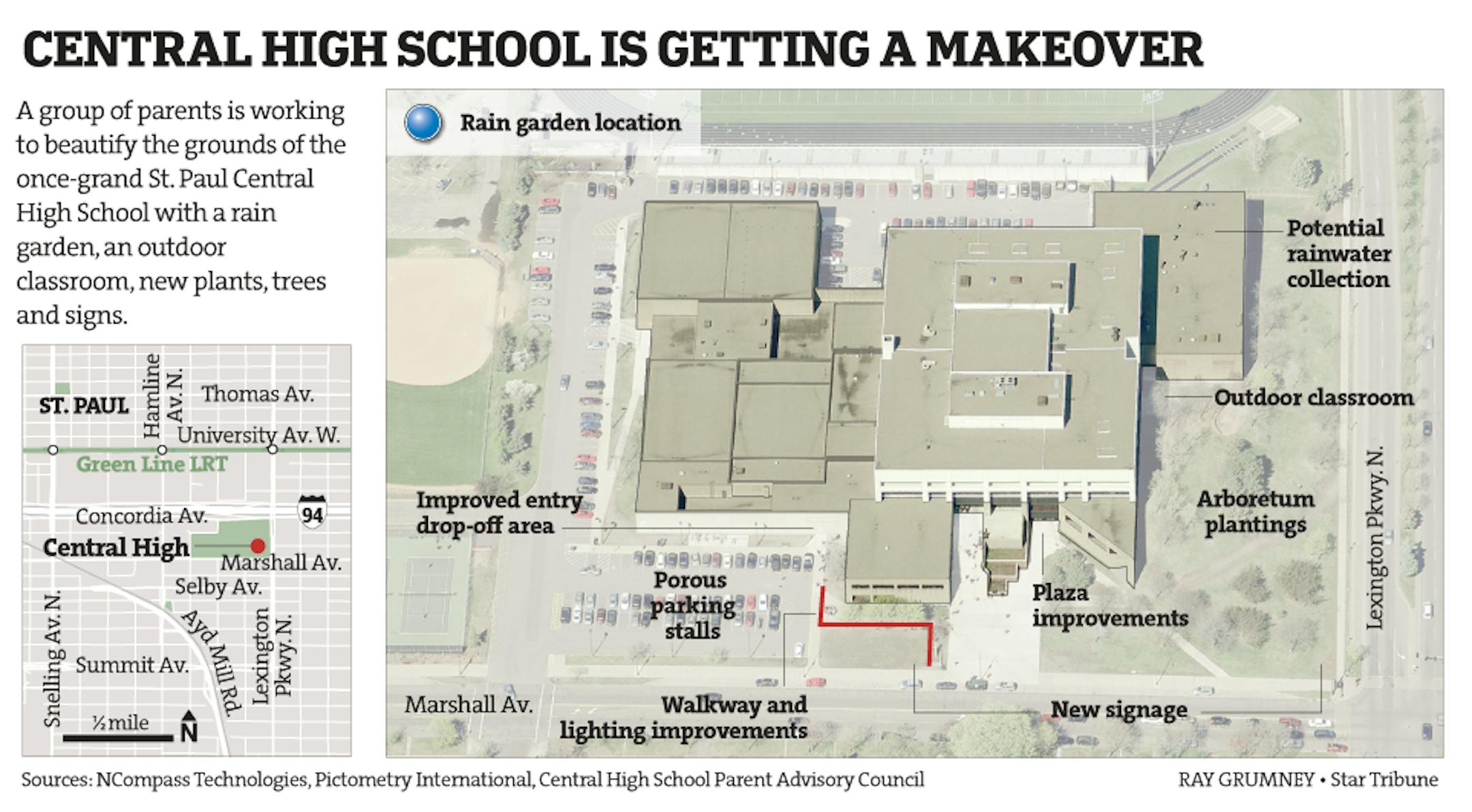 A group of parents is working to beautify the grounds of the once-grand St. Paul Central High School with a rain garden, an outdoor classroom, new plants, trees and signs.