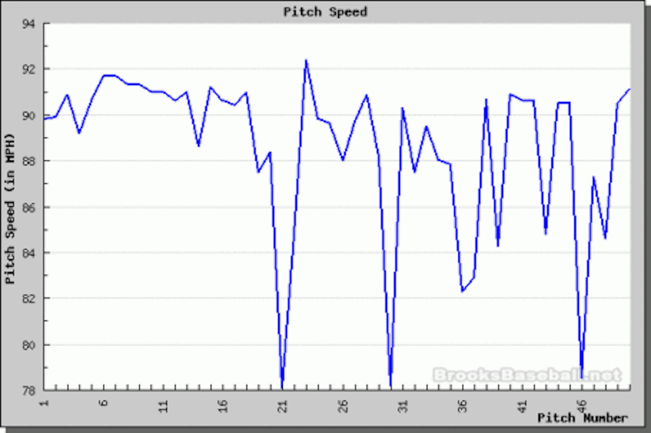As you can see from his pitch speed chart below from that outing, it wasn't until his 21st pitch of the evening that Blackburn spun his first curveball over. By that time, it was already 3-0 Phillies.
