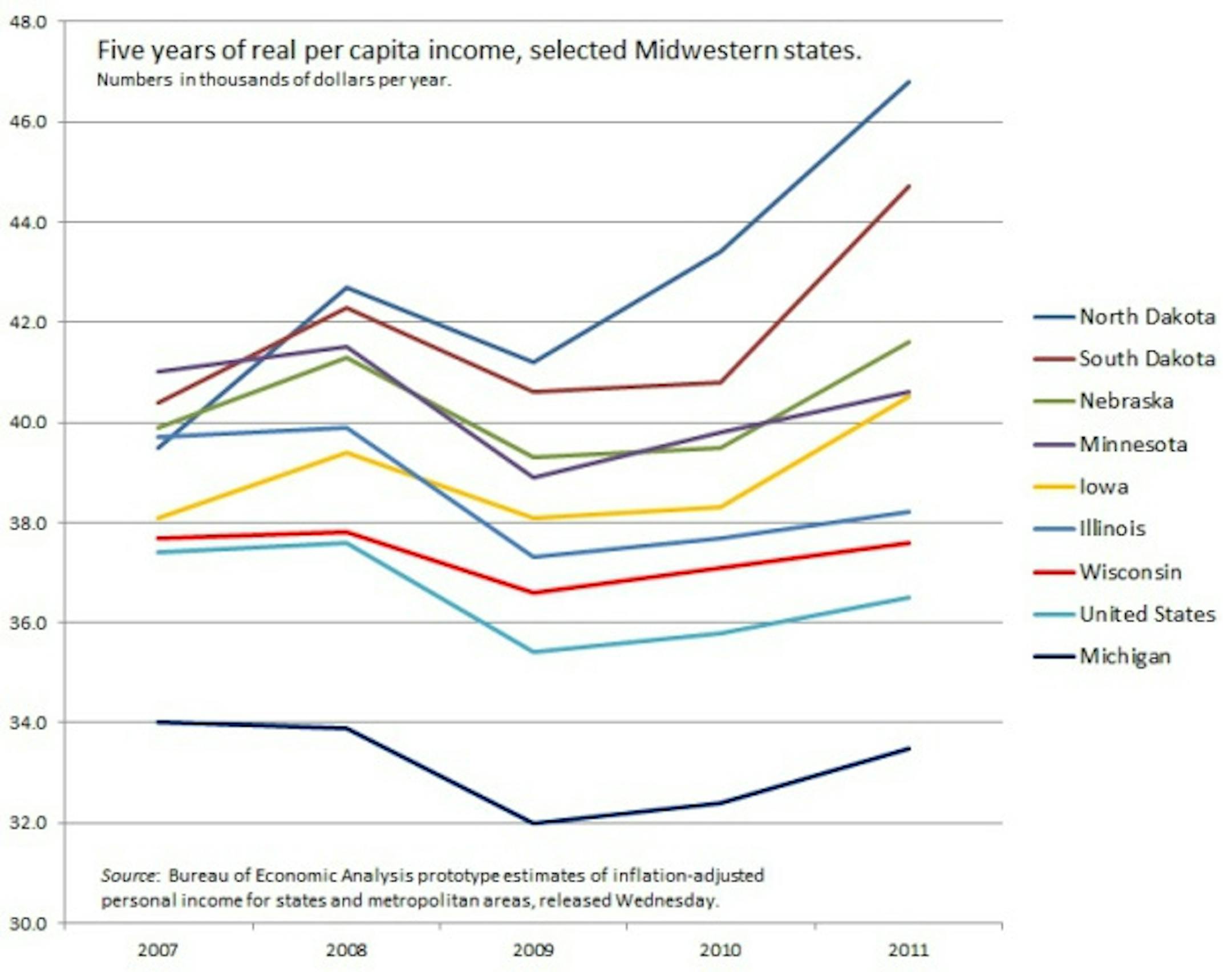 In 2007, Minnesota ranked sixth in the country and first in its region according to the measure, with real per capita income estimated at $41,000. It has since sank slightly to $40,600 per year, and has been surpassed by North Dakota, South Dakota and Nebraska. Iowa has nearly caught Minnesota too.