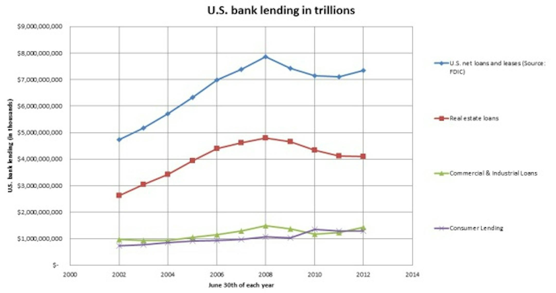 In all, banks held $7.3 trillion in outstanding loans at the end of June, according to the FDIC. That's a lot, but it's still 6.5 percent less than June 2008, right as the country teetered on the precipice of recession.