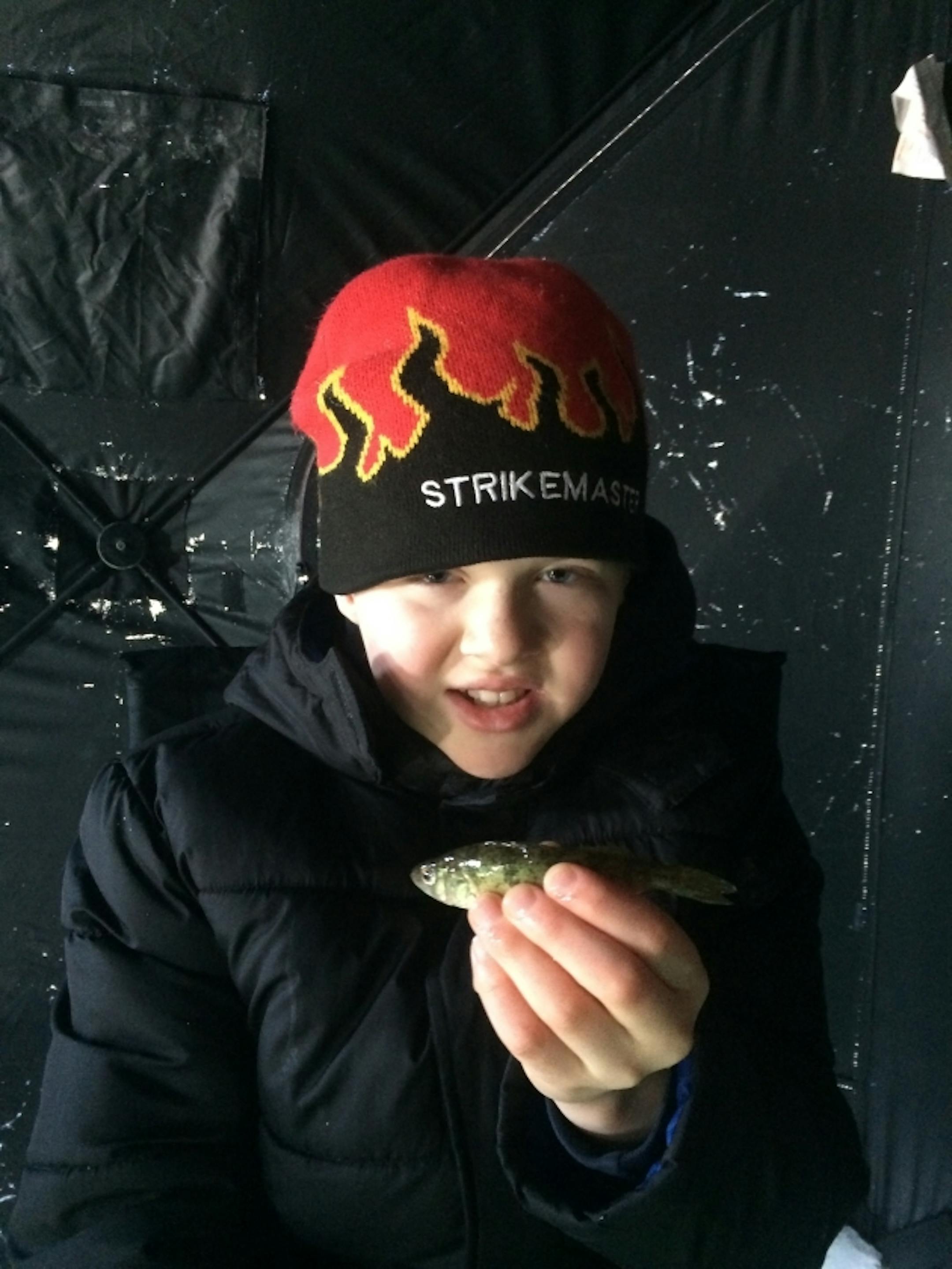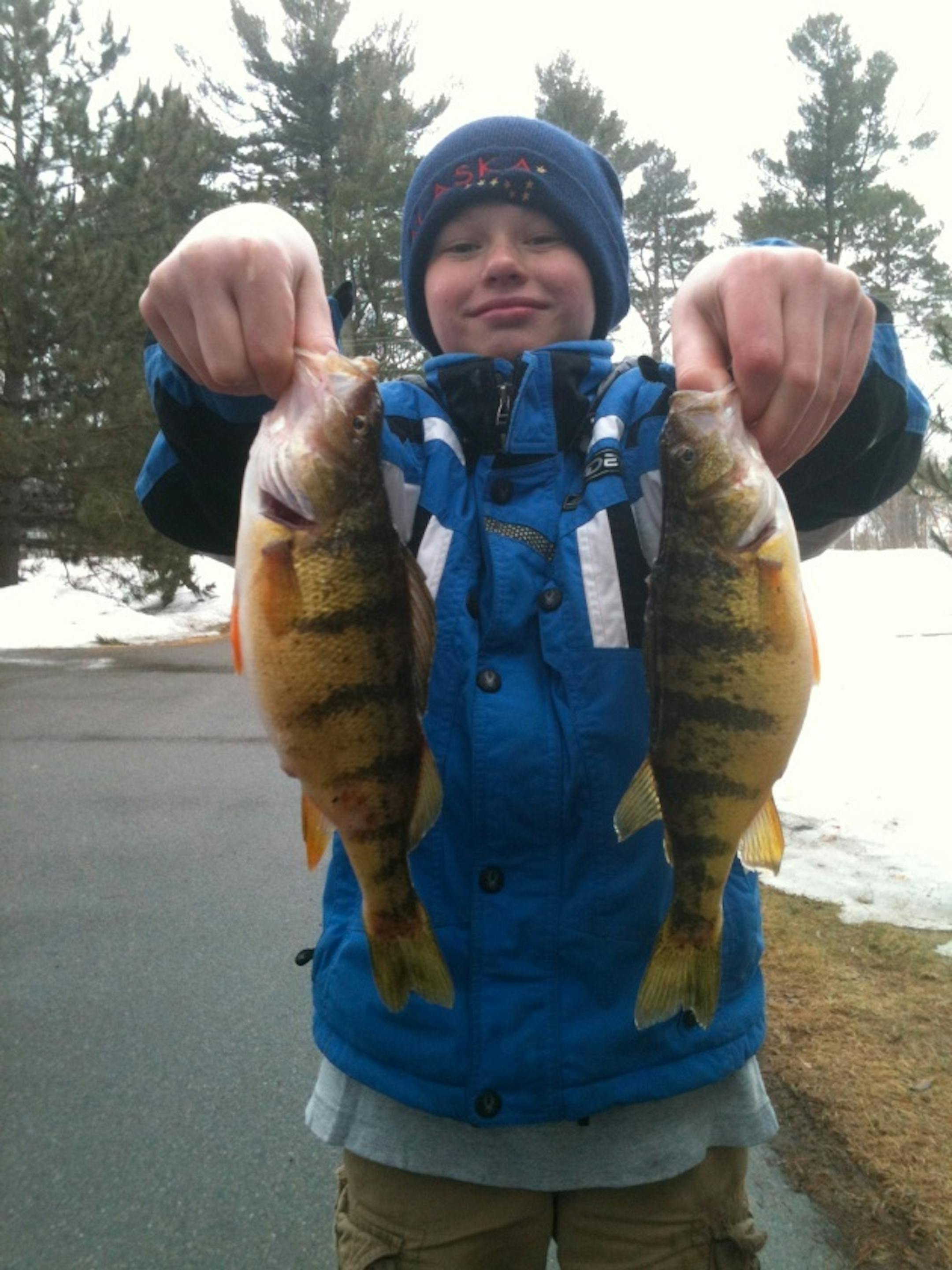 Theo Petrie holds two Leech Lake Jumbo Perch