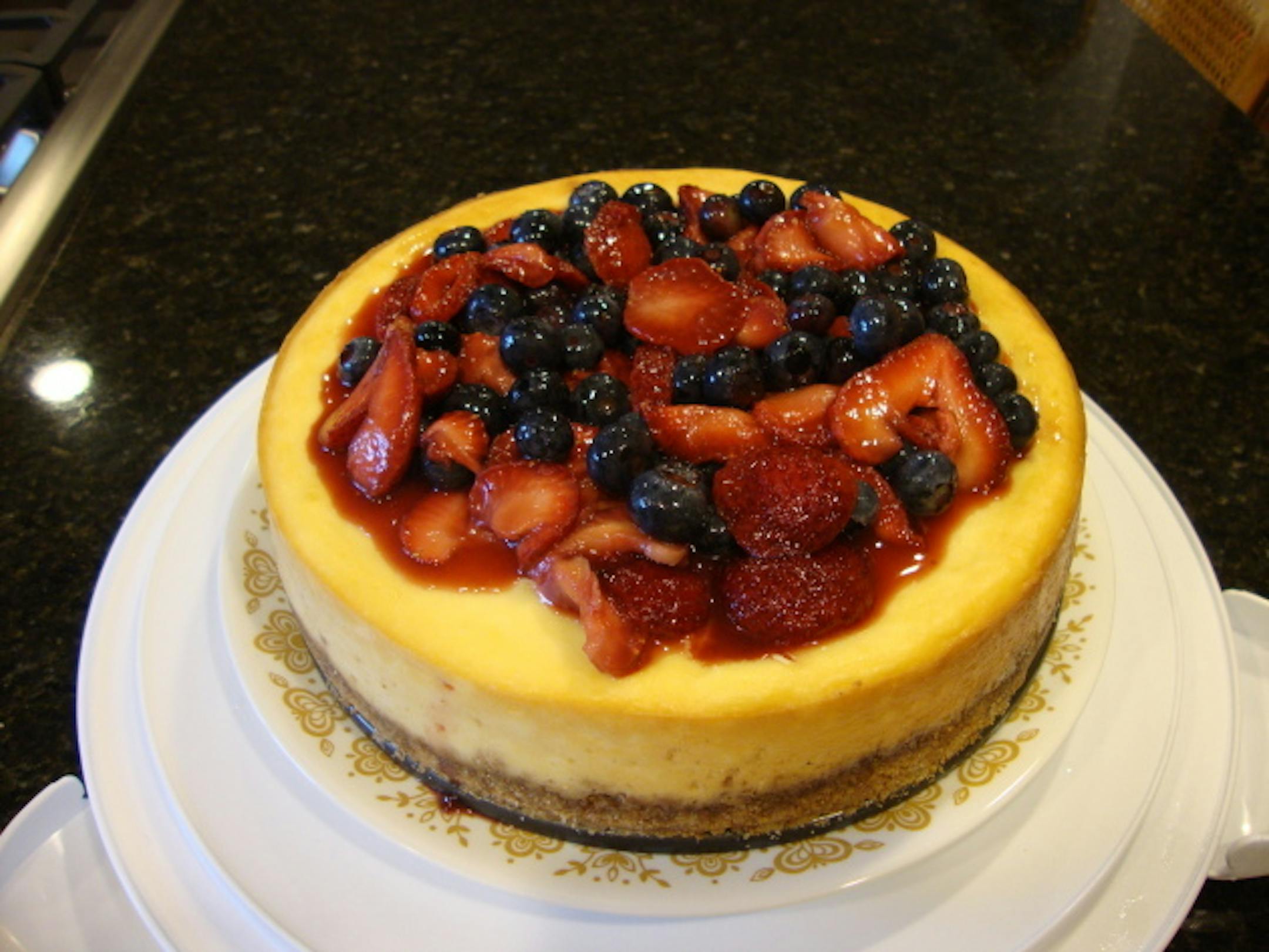 Topping: 1 cup each sliced strawberries and blueberries, 1/2 cup any flavor jam or jelly, melt on stovetop and refrigerate.