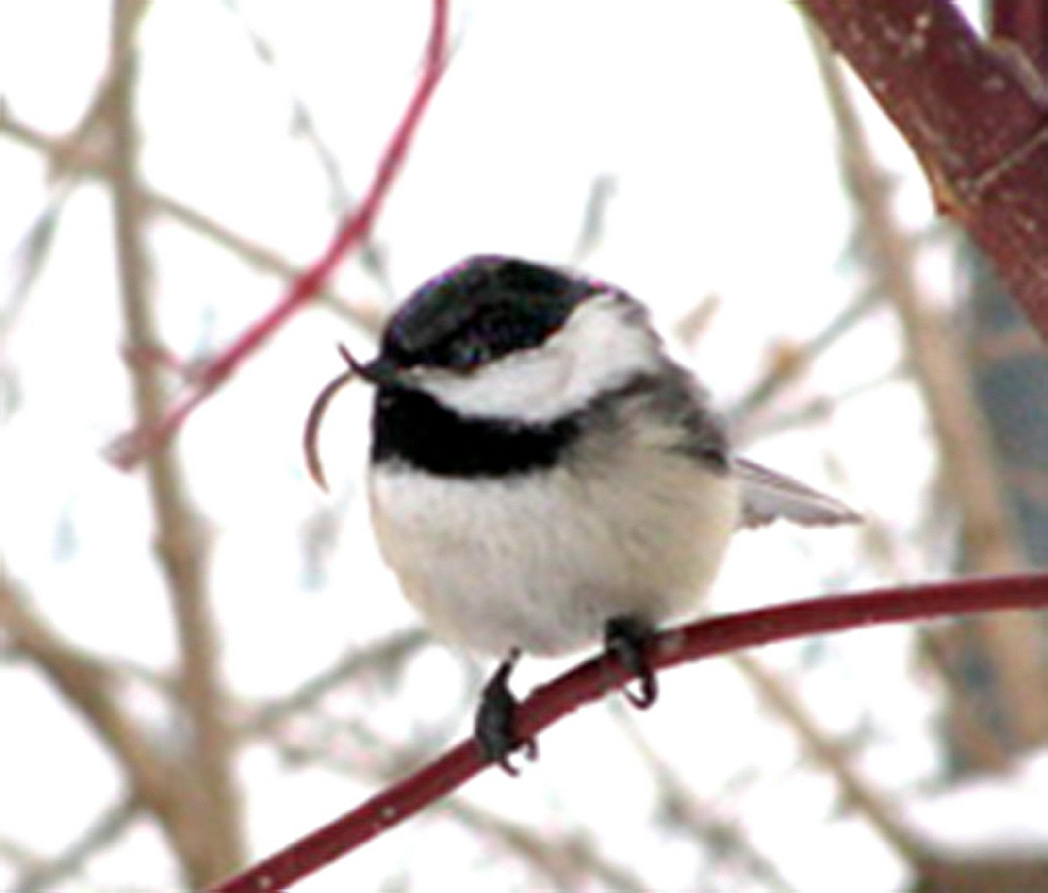 I know of no such sightings for Minnesota. Now we have one. A birder in Maple Grove recently sent me this photo. The chickadee has been seen at his feeders since late December. He said that the upper mandible seems to be growing.