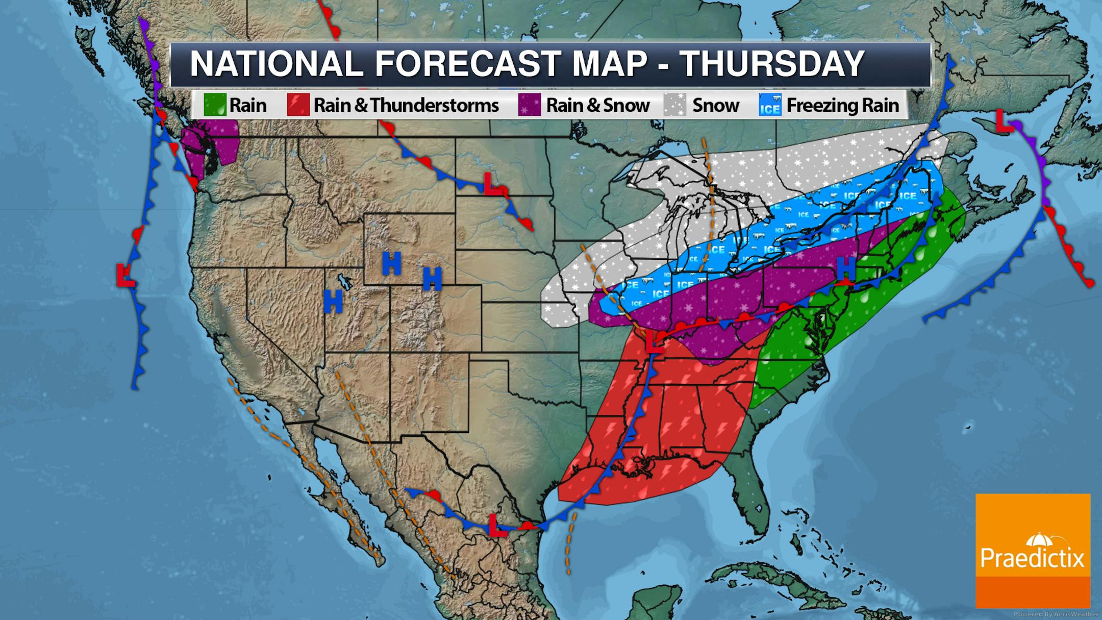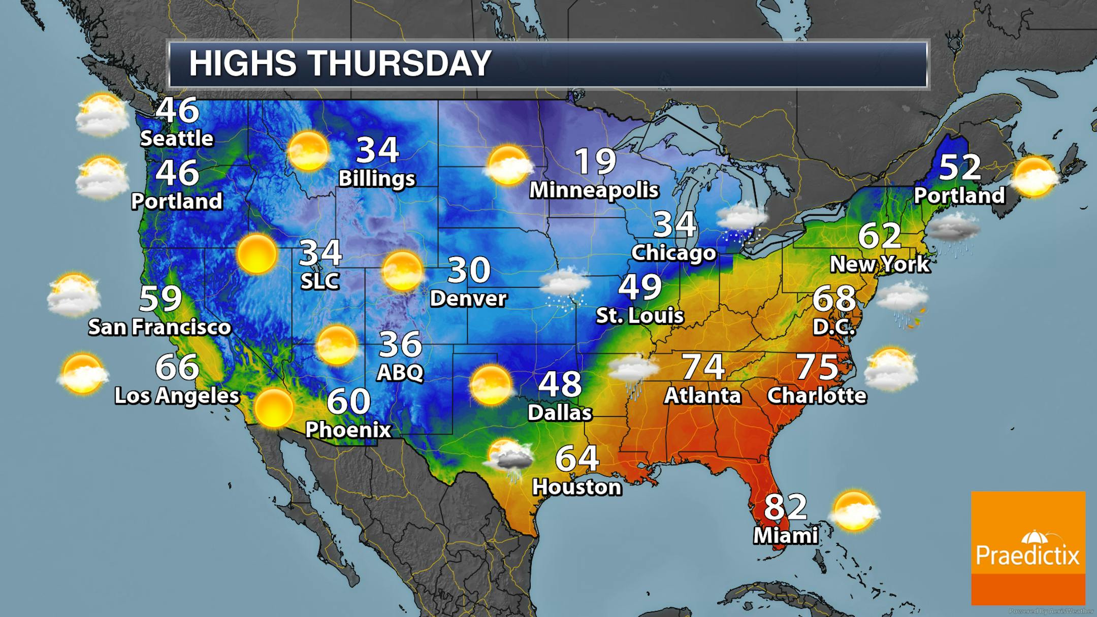 Behind the system that brought us our rain and snow in the middle of the week comes calmer and colder air for Thursday. Temperatures will remain in the teens throughout the day - starting off in the low teens and climbing into the upper teens for highs. We'll be on the edge of cloud cover from a system passing to our southeast, so I expect a cloudy start to the day with sunnier conditions into the afternoon.