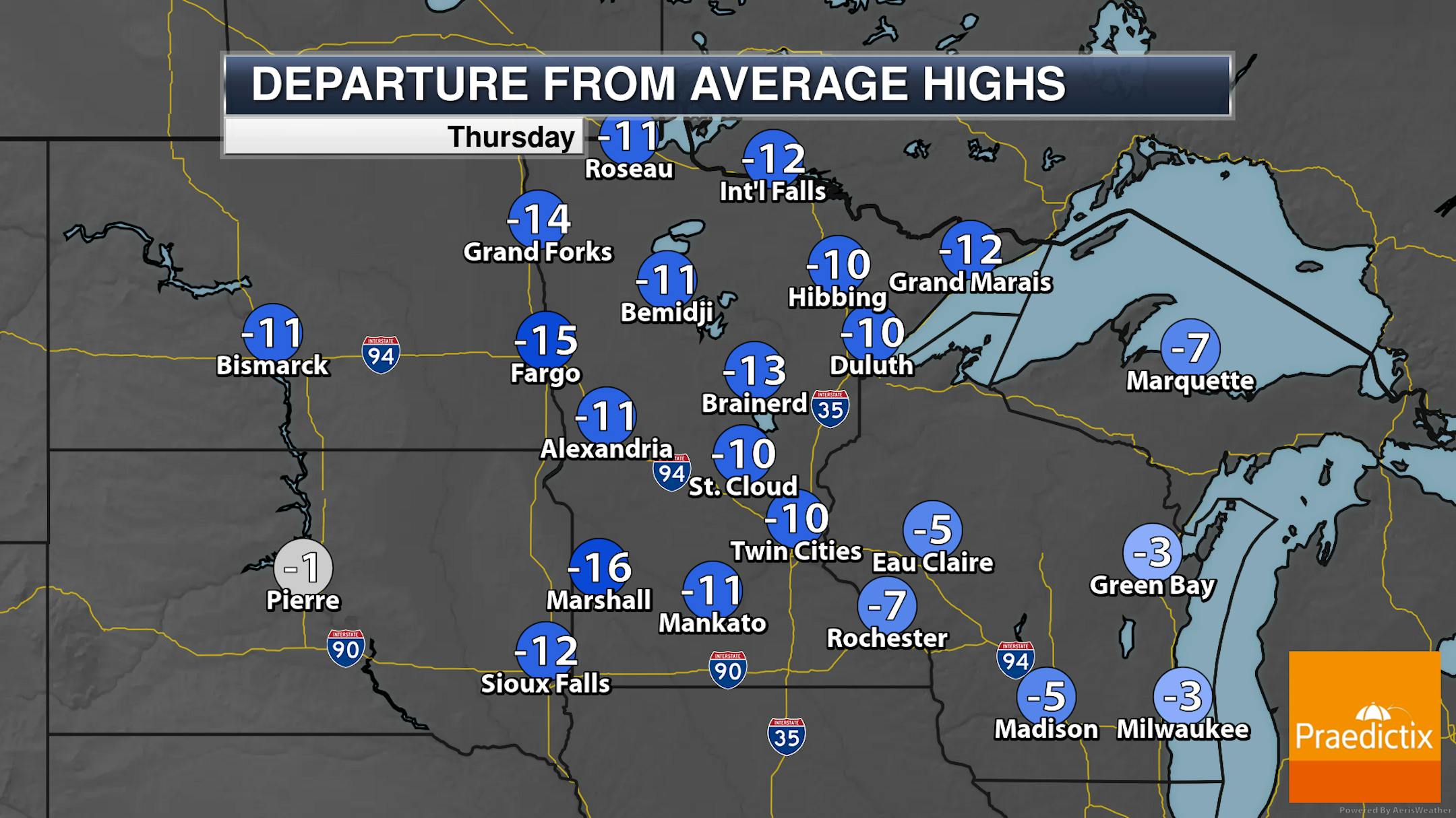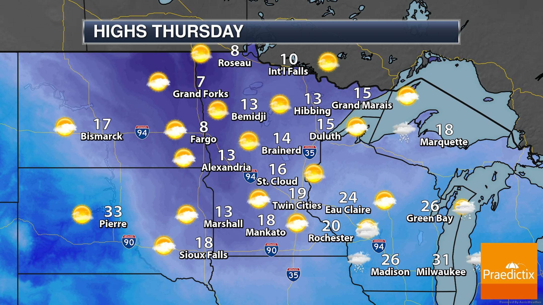A system passing mainly to our south and east could slightly clip far southeastern Minnesota with light snow on Thursday, though most of the snow will fall across Iowa and Wisconsin. Cloudier conditions will be expected in the morning hours across southern Minnesota, with sunnier skies by the afternoon. More sun than clouds will be expected throughout the day as you head farther north. Highs will range from the single digits in northwest Minnesota to around 20F in southeast Minnesota.