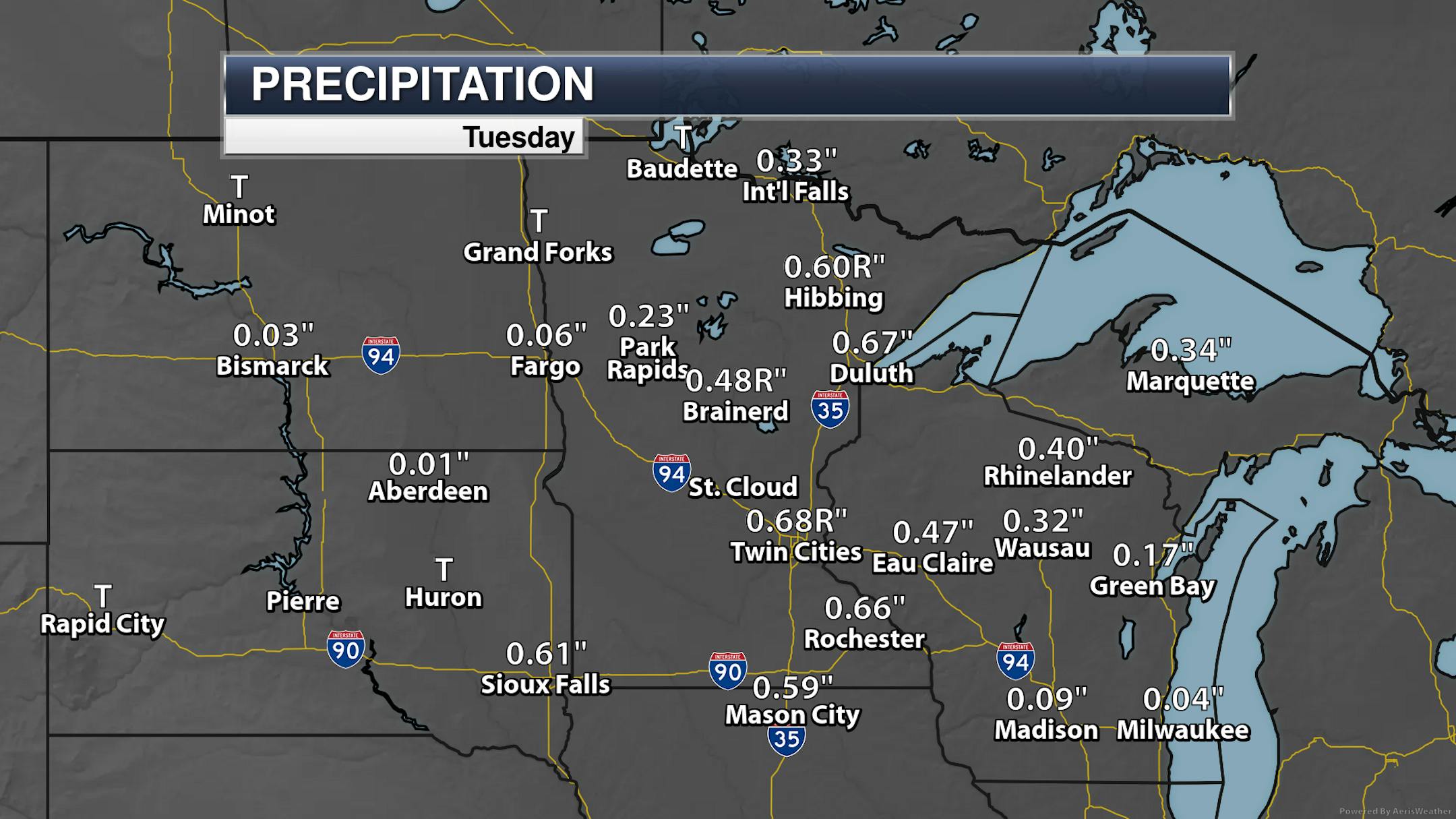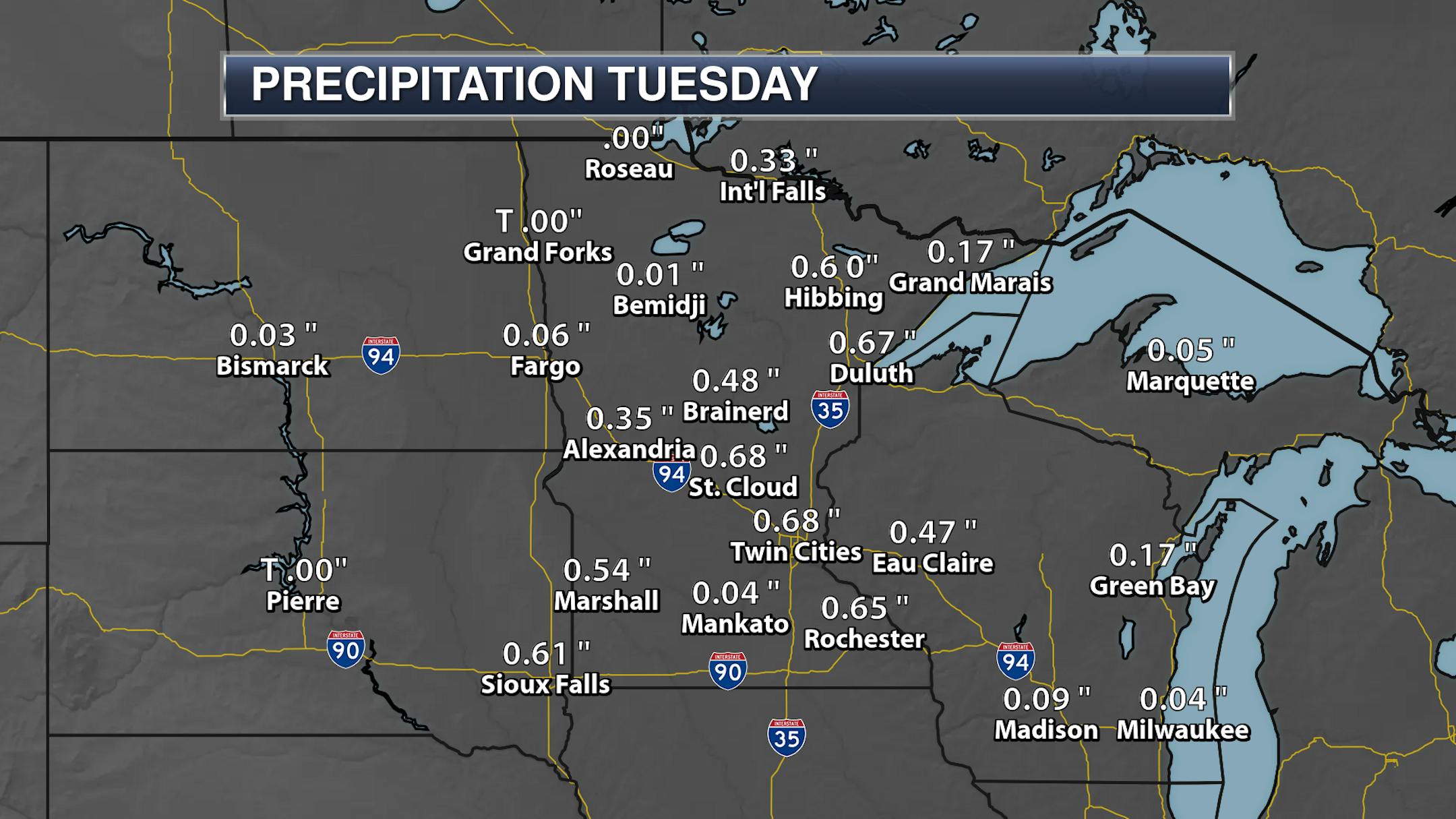 The Twin Cities wasn't the only location that saw record rain on Tuesday - both Brainerd and Hibbing also broke records. The airport location that had the most rain on Tuesday was Paynesville with exactly 1" of rain.