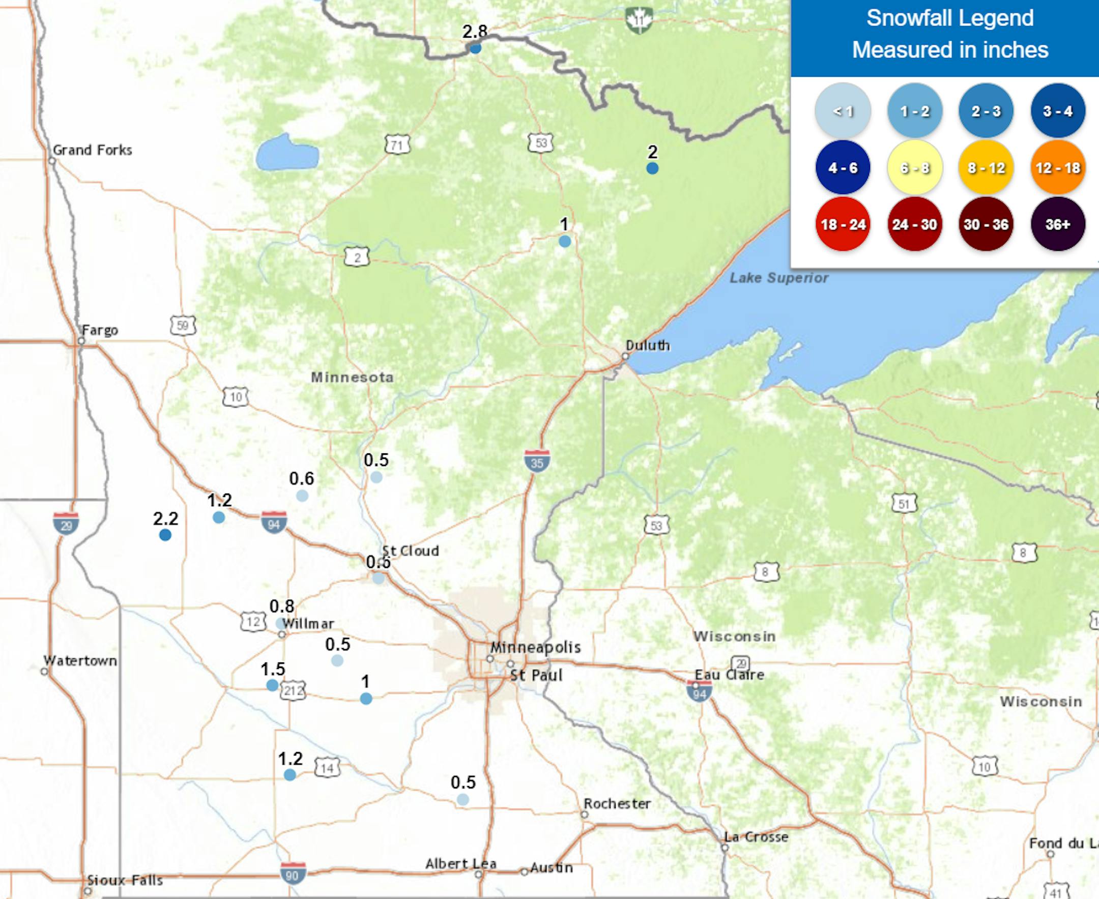 Parts of northern and western Minnesota saw more snow than rain with this system, with a few 2"+ tallies. The highest report was in International Falls where 2.8" was reported. Donnelly reported 2.2" and Ely reported 2".