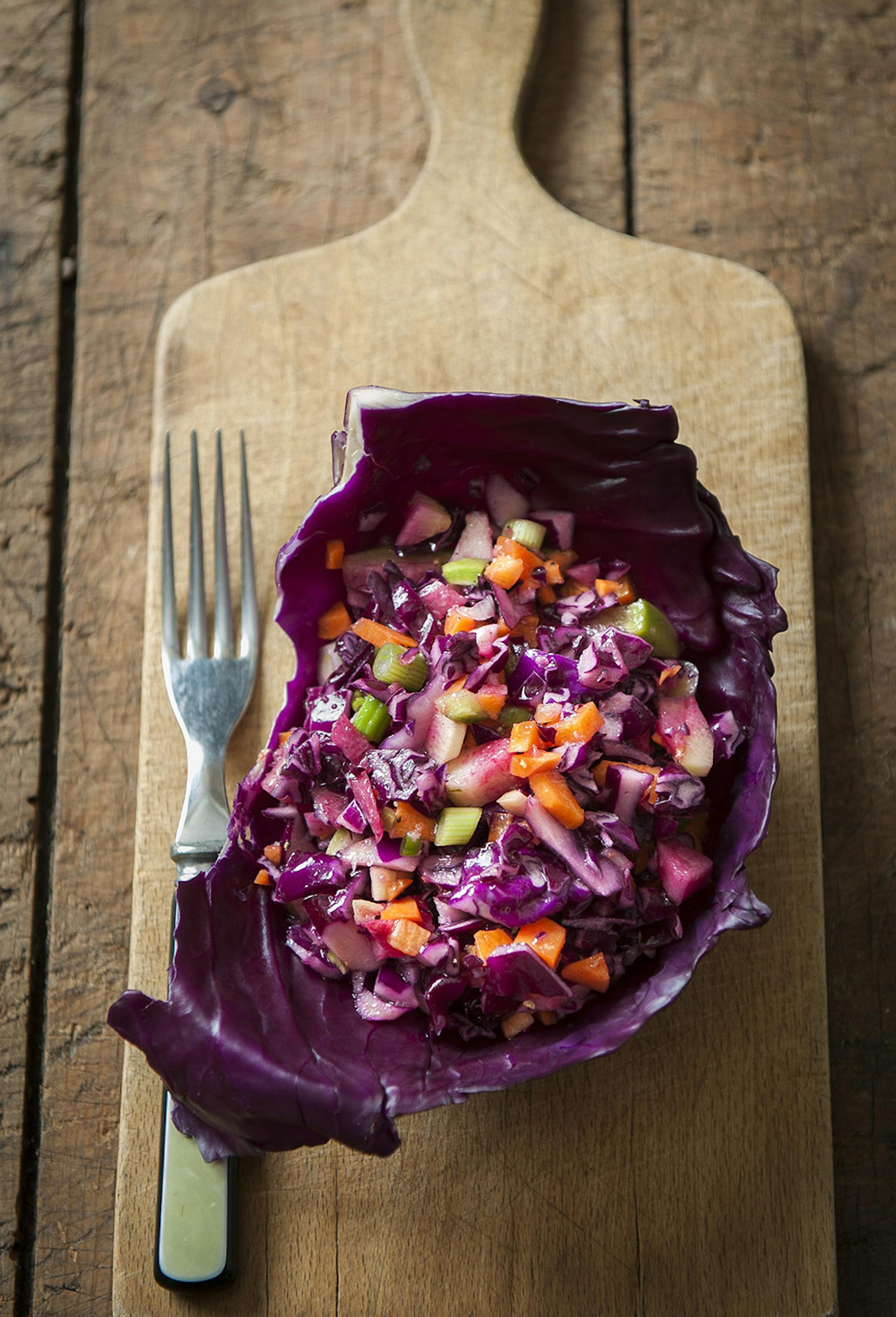 It's lively, crunchy and tangy and helps to lift those wintry blahs. There's something about the local red cabbage in winter; it seems more mellow and a tad sweeter than when first harvested in the late fall. Perhaps it's the brilliant colors in this salad that never fail to brighten my day. Its outer leaves, often too tough to eat, make wonderful mini-bowls.