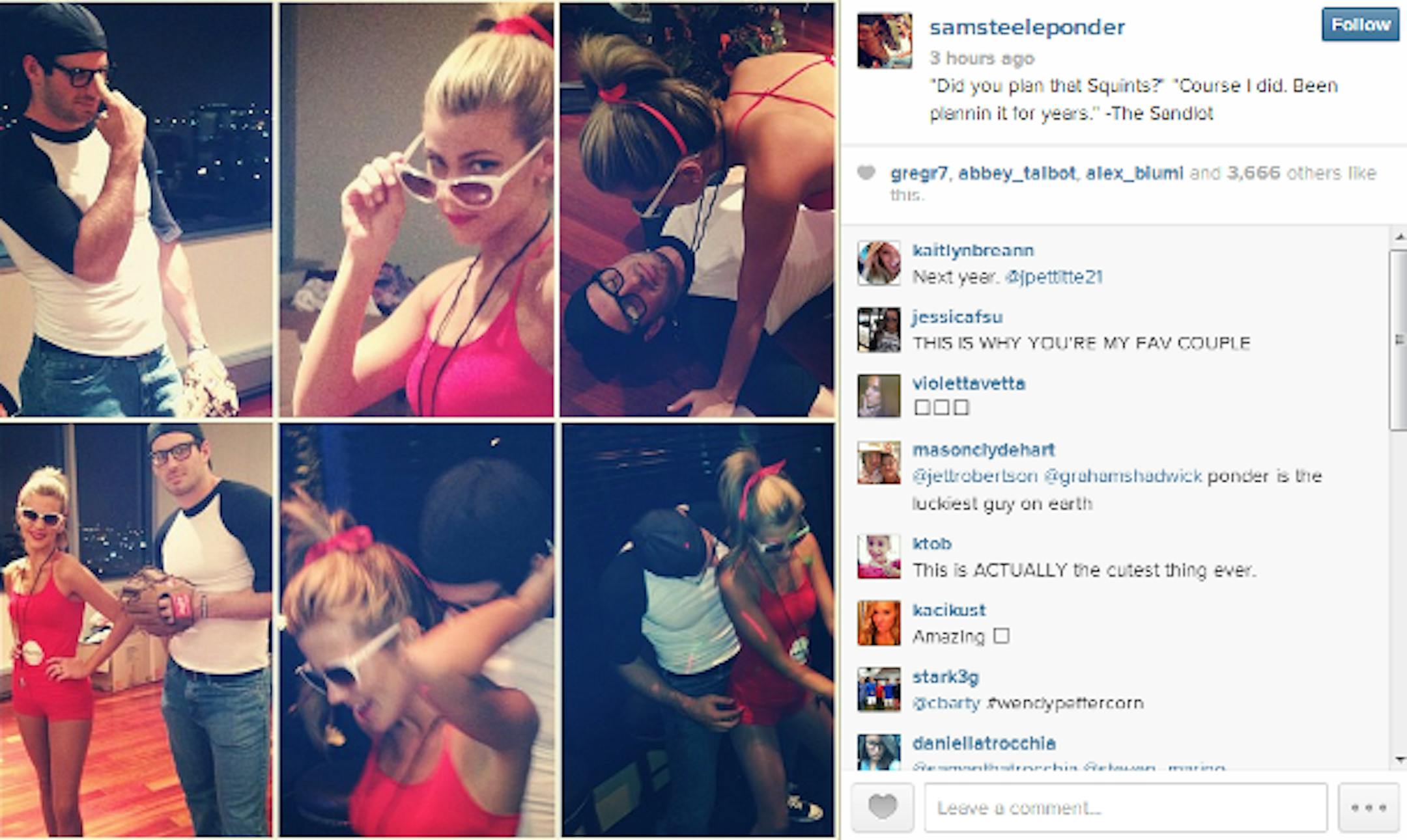 Take your pick. Either way, the couple dressed up as 'Squints' and Wendy Peffercorn from 'The Sandlot.' We can only assume the real Squints, who was here a few months back, would approve. Here is the photo collage from Sam Ponder's Instagram: