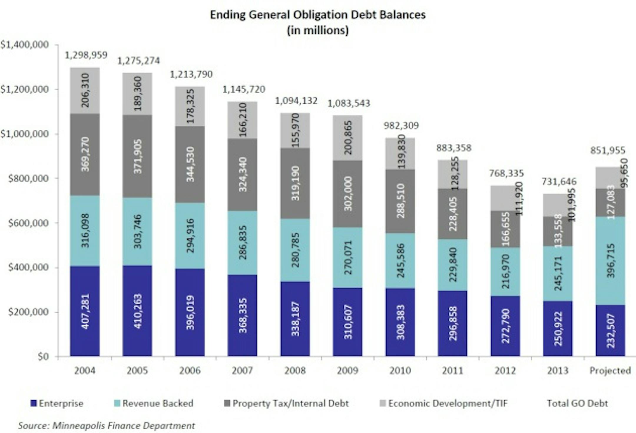 That wouldn't ordinarily be news, but it's the first time in a decade that the city's general obligation debt balance -- tied to the full faith and credit of the city -- will increase rather than decrease. Paying down the formerly debt-ridden budget is an achievement often cited by former Mayor R.T. Rybak and current Mayor Betsy Hodges.