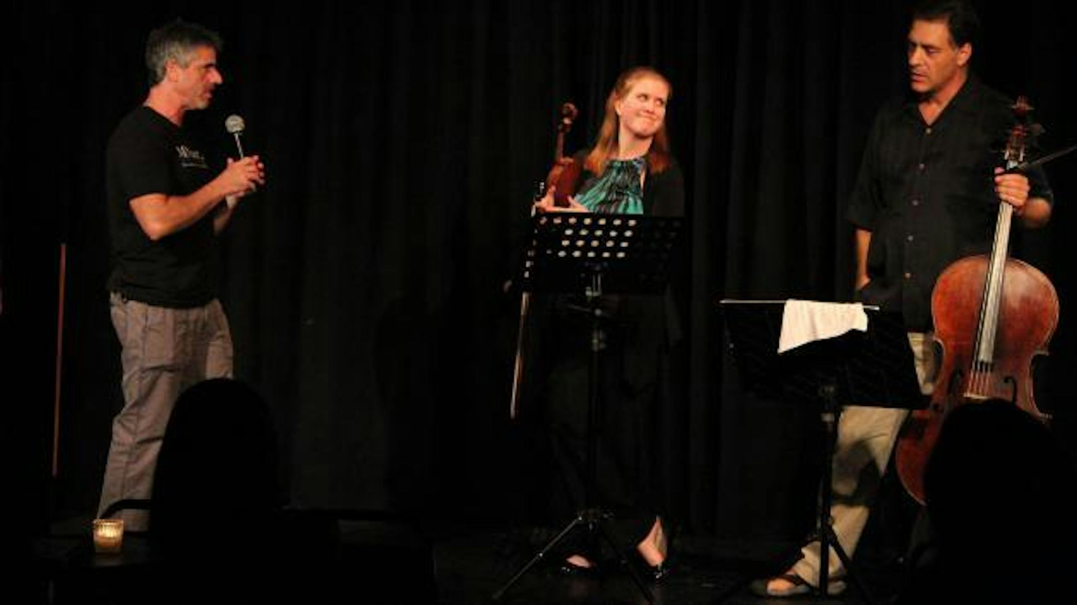 Host Matt Peiken interviews Erin Keefe and Tony Ross after their performance at the Bryant Lake Bowl. Photo by Jon Robert Gustafson