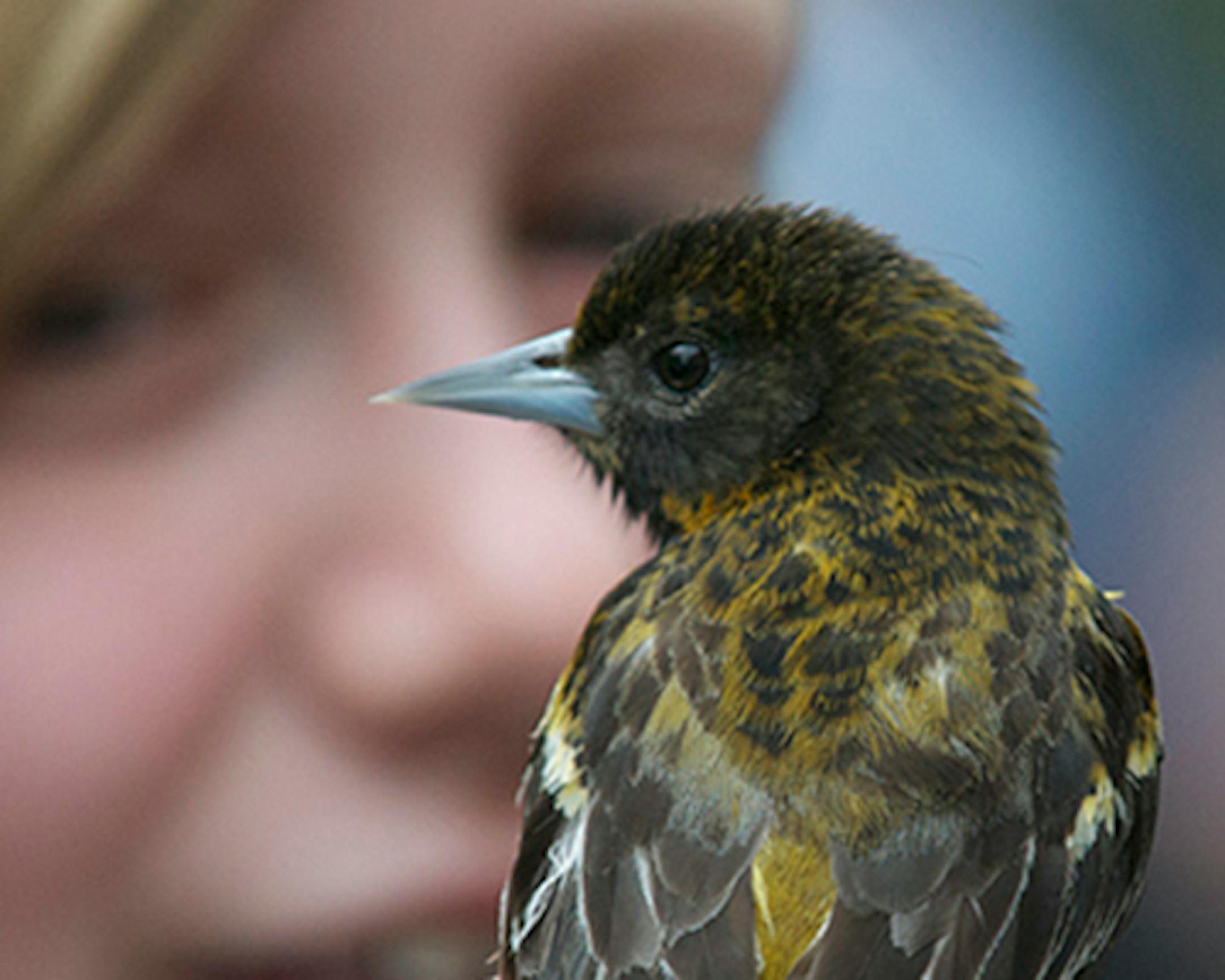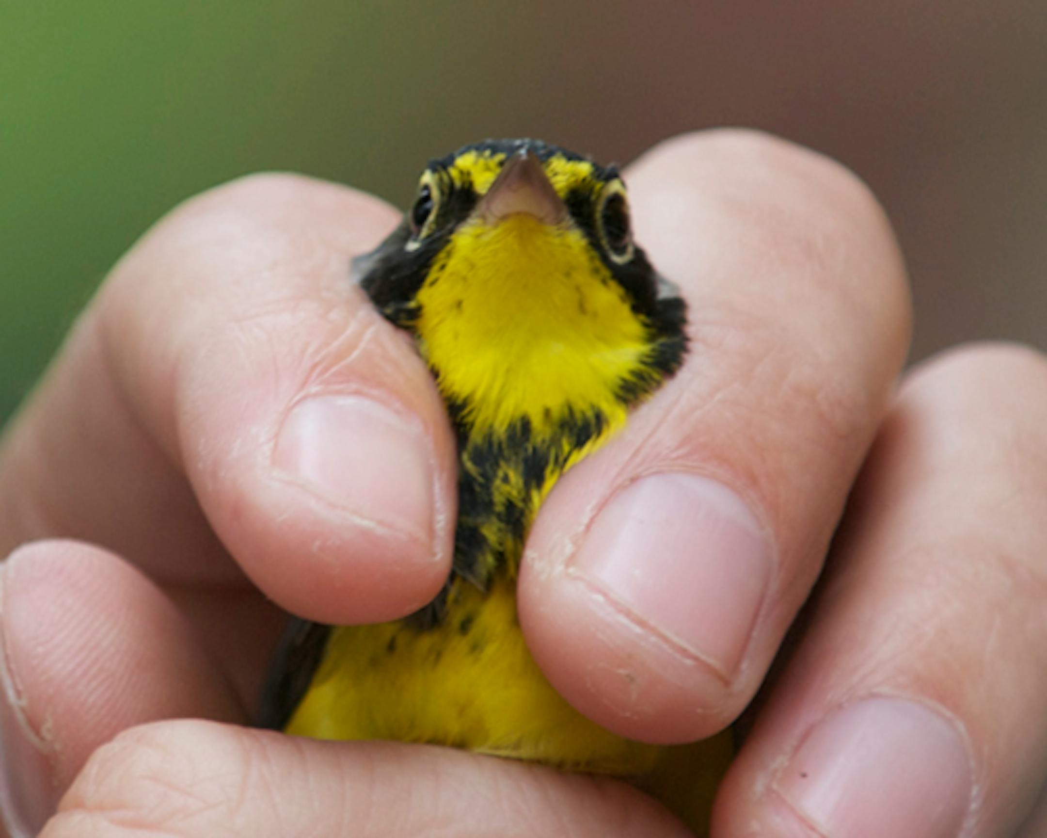 Bird-banding is in high gear right now as banders try to capture as many migrants as possible. Banding is a harmless method of putting an identification "bracelet" on a bird while gathering information about its breed, sex, age, and physical condition. The bird might be captured again by another banding station, allowing a travel track to be established, but the most important part of the effort is the data the banders record. We watched banding at Magee Marsh Wildlife Area in Ohio on Saturday as part of our birding visit there. Birders have no better way to see wild birds almost nose to beak. I highly recommend it. You often can find information on banding events in the Home and Garden event calendar (Wednedays, StarTribune H&G section). Or, call your local nature center or county park. It's worth a trip, especially for children who have not experienced the wonder of birds. I took these photos at Magee Marsh. We have a two-year-old Baltimore Oriole (its black color not fully expressed yet) with a young admirer, a Canada Warbler gently and firmly held while his audience gets a close look, and a Wilson's Warbler about to be released after making its contributions. At Magee, members of the audience were given the chance to hold the bird and release it. Children and adults one and all find this to be memorable. That opportunity is often given at banding demos here, too.