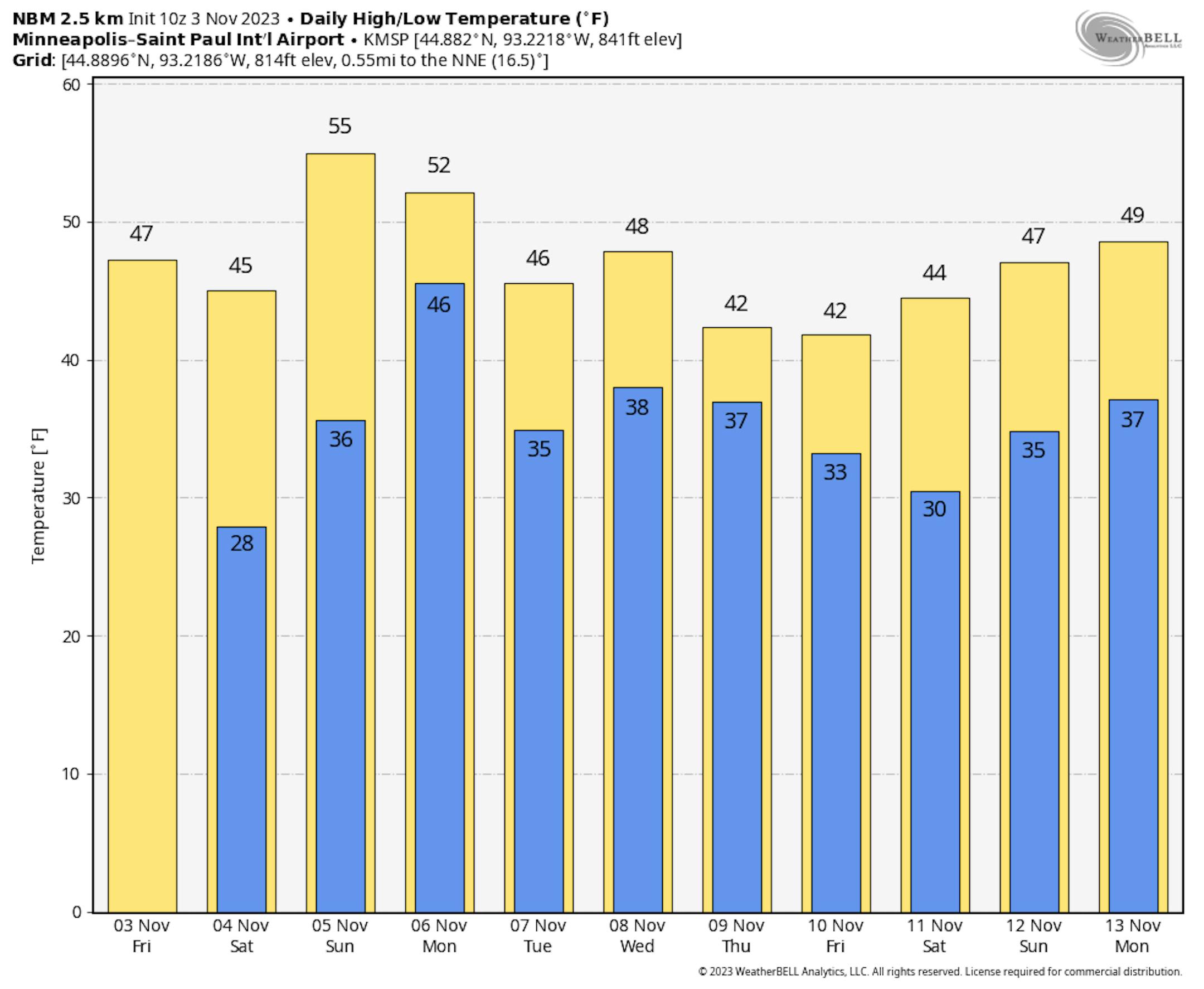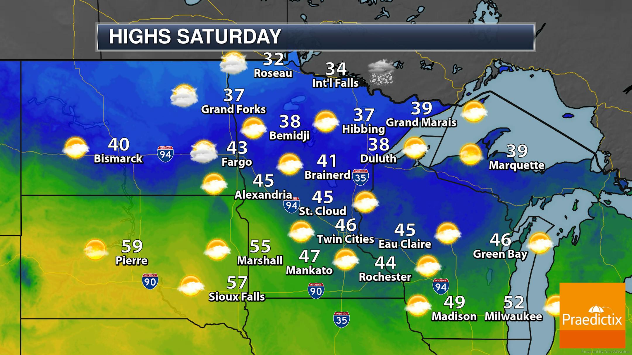 An isolated snowflake can't be ruled out on Saturday along the International Border, otherwise, quiet weather is expected across the state for the Deer Opener. Skies will be cloudier across northern Minnesota, with more peeks of the sun the farther you go south. Highs range from freezing in northwestern Minnesota to the 50s in southwestern areas (areas that also see more sunshine).