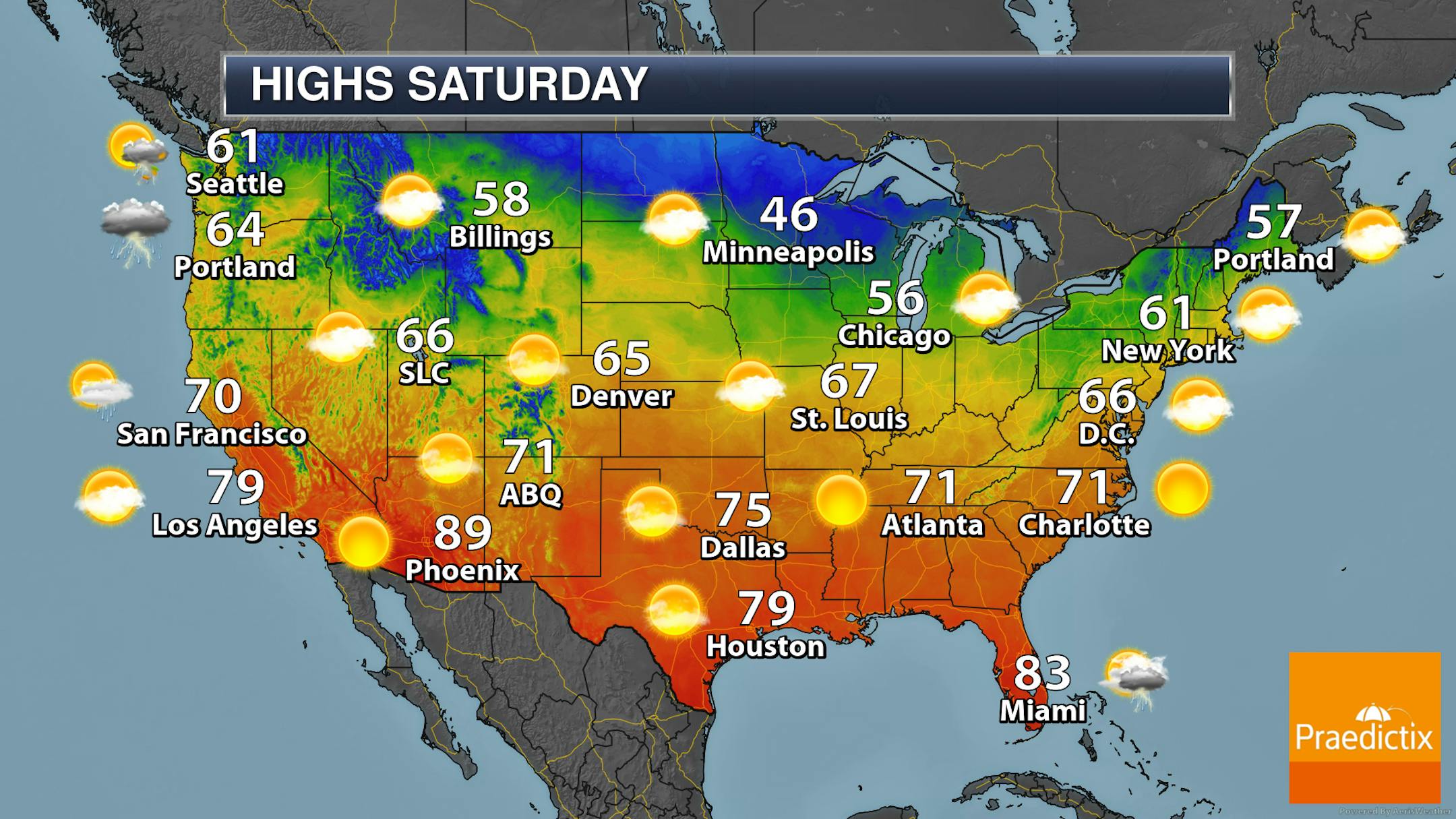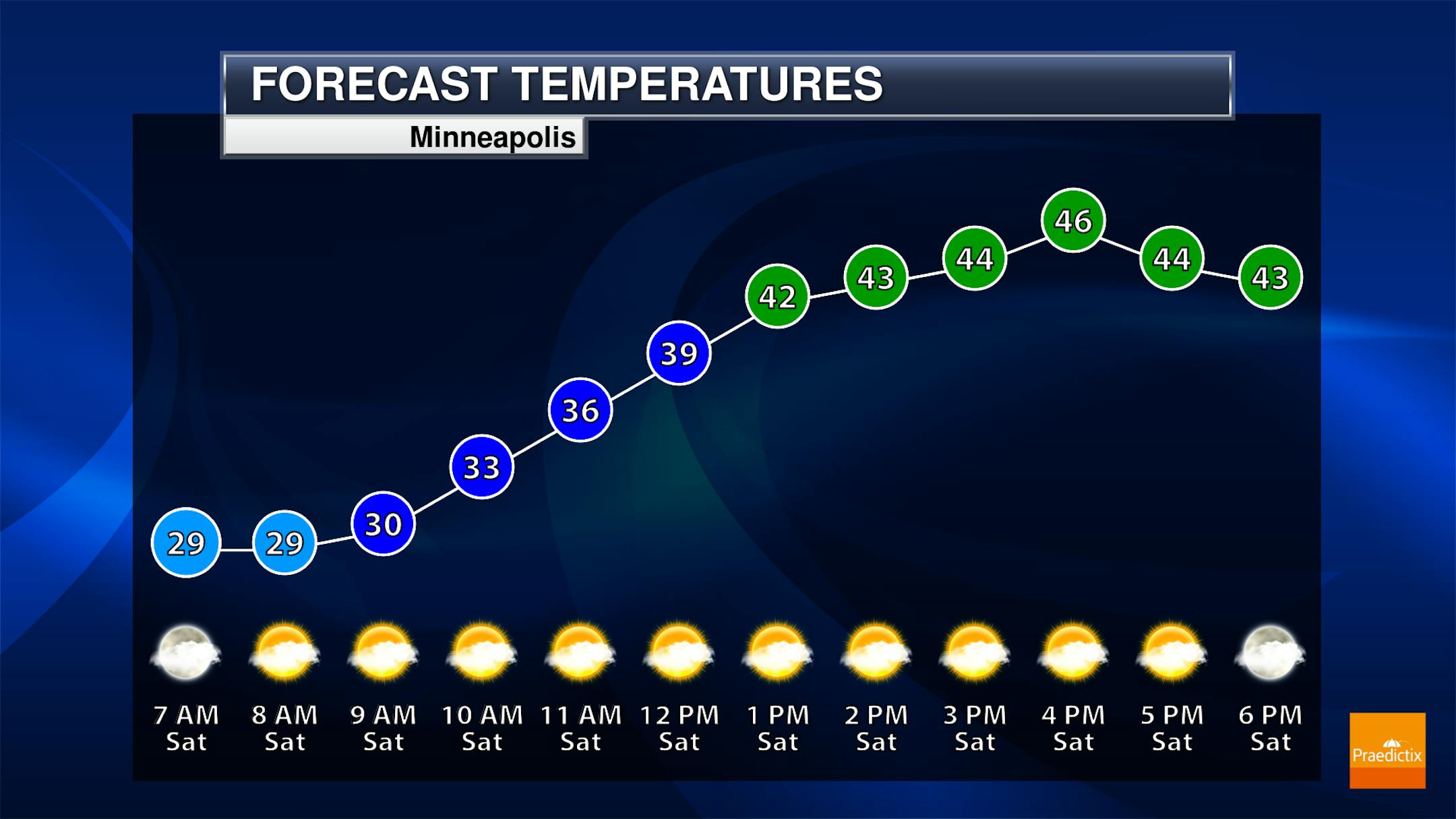 I think we'll start out the day on Saturday in the metro with more clouds than sunshine; however, those clouds look to fade a bit to allow more sunshine as we head through the afternoon hours. Morning temperatures start off in the upper 20s with highs in the mid-40s.