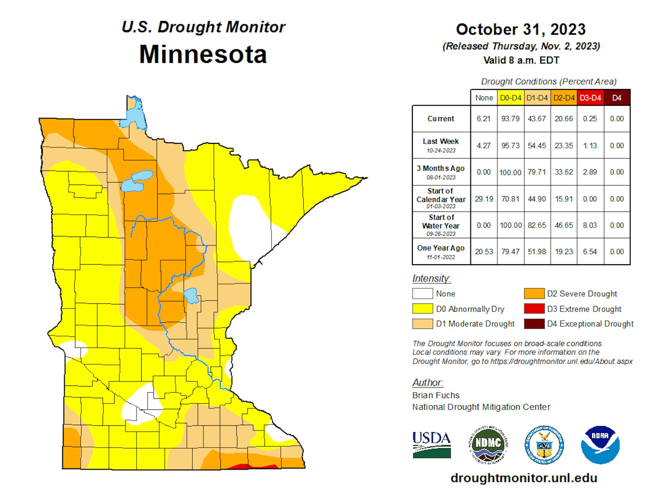 With that above-average precipitation, we saw some improvement in the drought monitor update released Thursday morning. While most of the state (93.79%) of the state is still at least abnormally dry, only 43.67% is at least in Moderate Drought, and 20.66% in Severe Drought. A sliver of southwestern Minnesota (0.25% of the state) still remains under Extreme Drought, but that is also down from 1.13% last week.