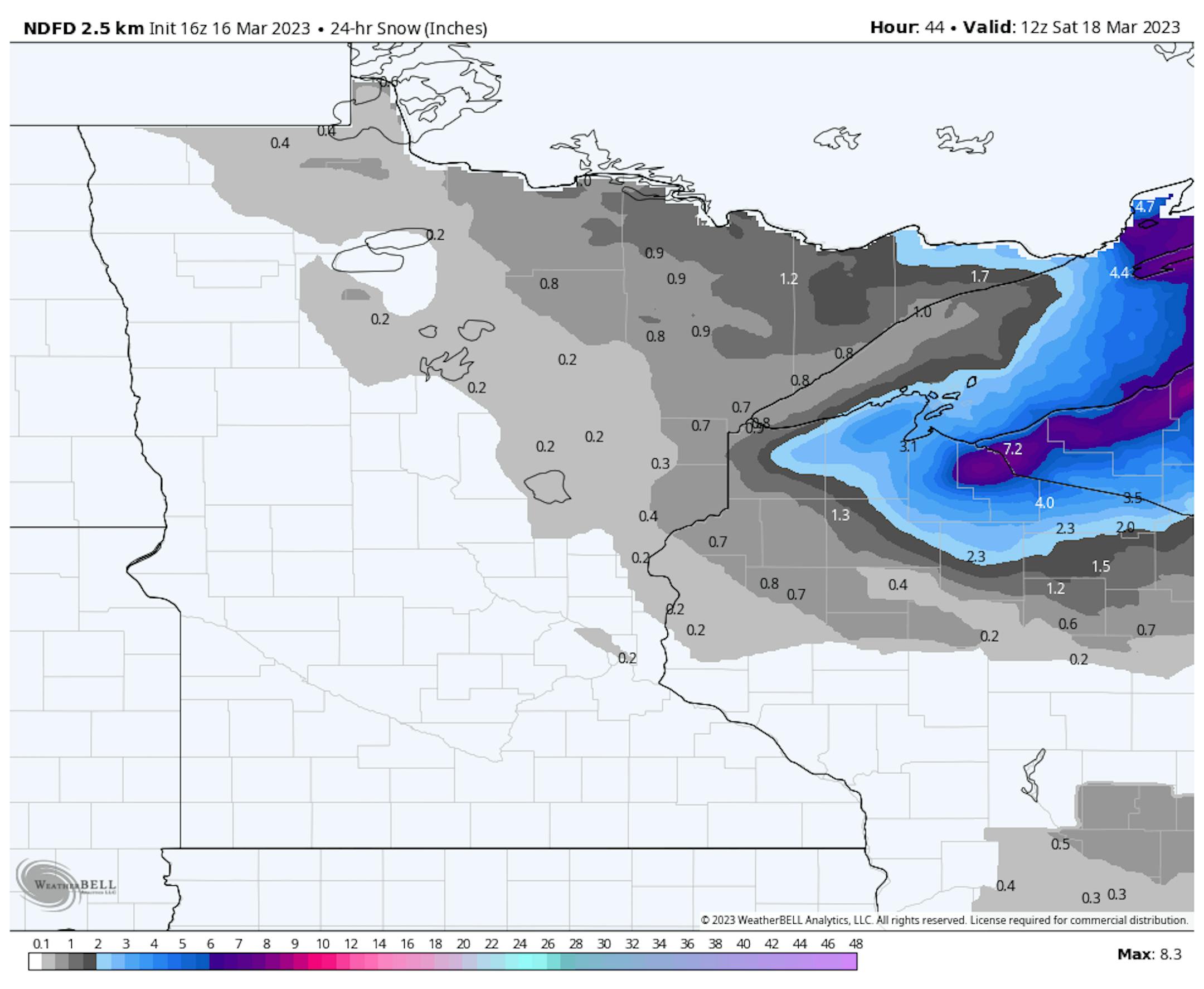 Here's expected snowfall between 7 AM Friday and 7 AM Saturday. The heaviest additional snow in Minnesota during this timeframe will be in the Arrowhead, where another inch or two will be possible. Snow also continues along the south shore of Lake Superior.