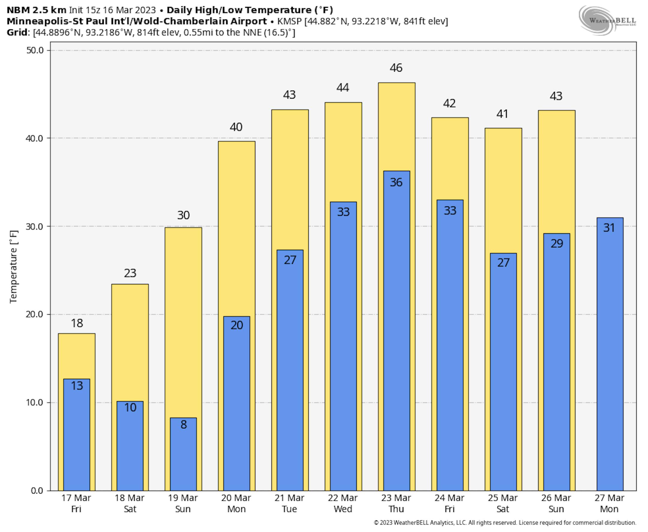 Happy St. Patrick's Day! A mainly cloudy and chilly Friday is ahead, with temperatures throughout the day in the mid to upper teens. However, with strong northwest winds at 15-20 mph and gusts to 30 mph, it'll feel more like 0F most of the day. I can't rule out a spare snow shower or flurry in the afternoon hours, but the chances are low.