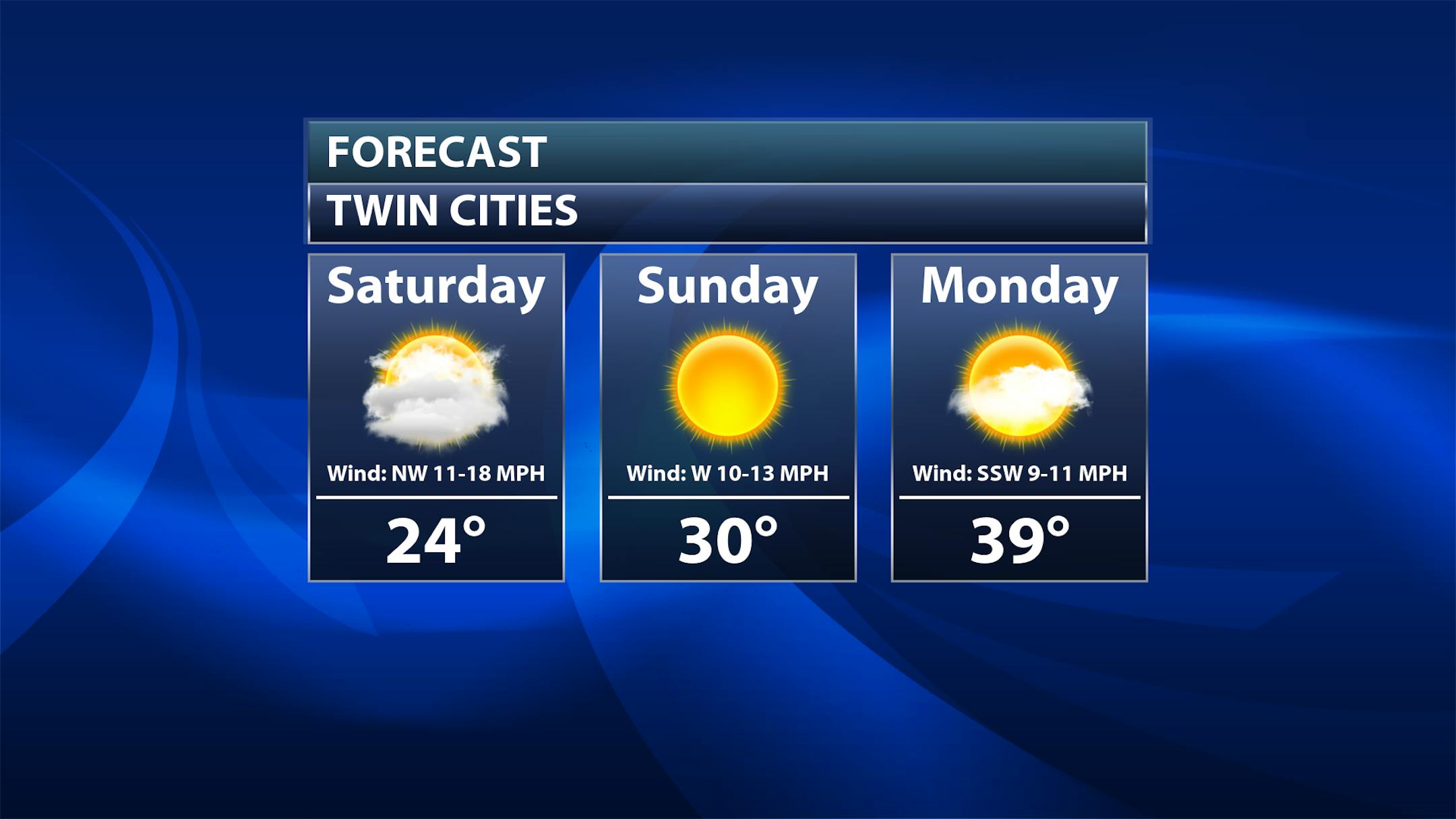 I can't still rule out an isolated flurry on Saturday here in the metro, but it should be mainly quiet and cloudy. Winds stay strong, with northwest gusts to 30 mph possible. Highs will climb back into the mid-20s. Sunnier weather moves in Sunday and Monday, and temperatures will continue to climb upward both days - around 30F Sunday, then around 40F Monday.