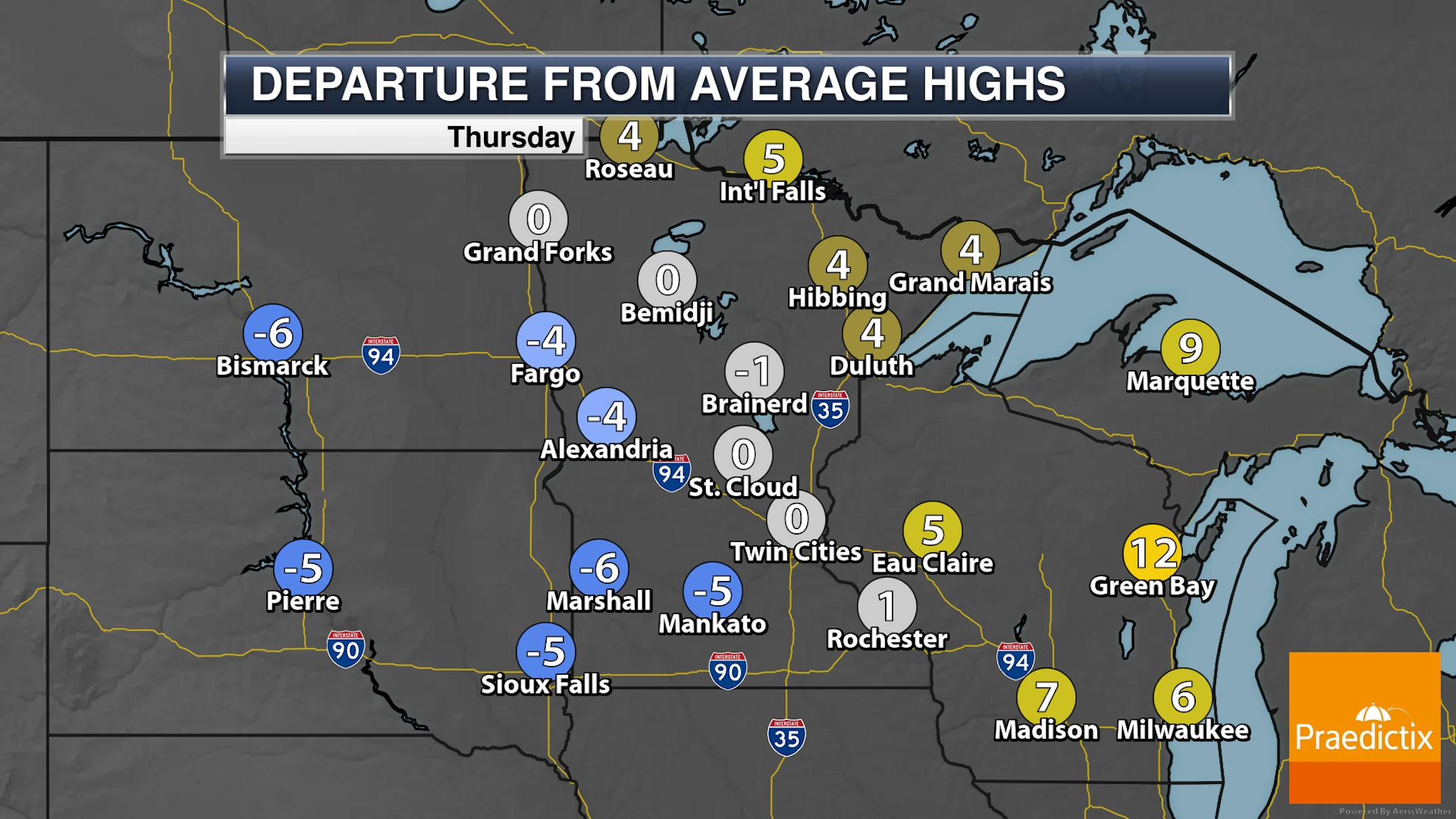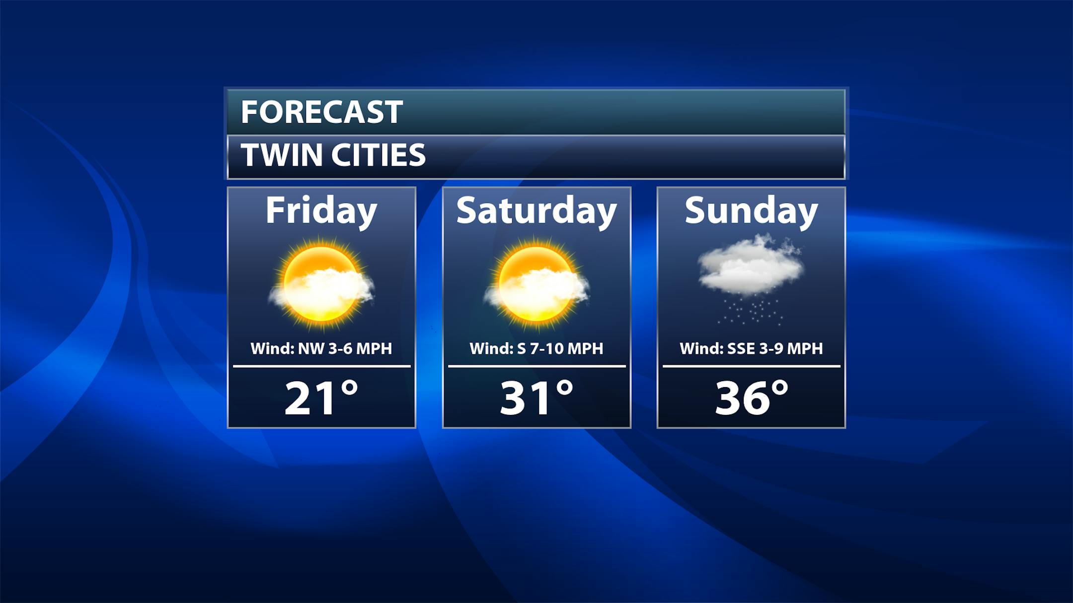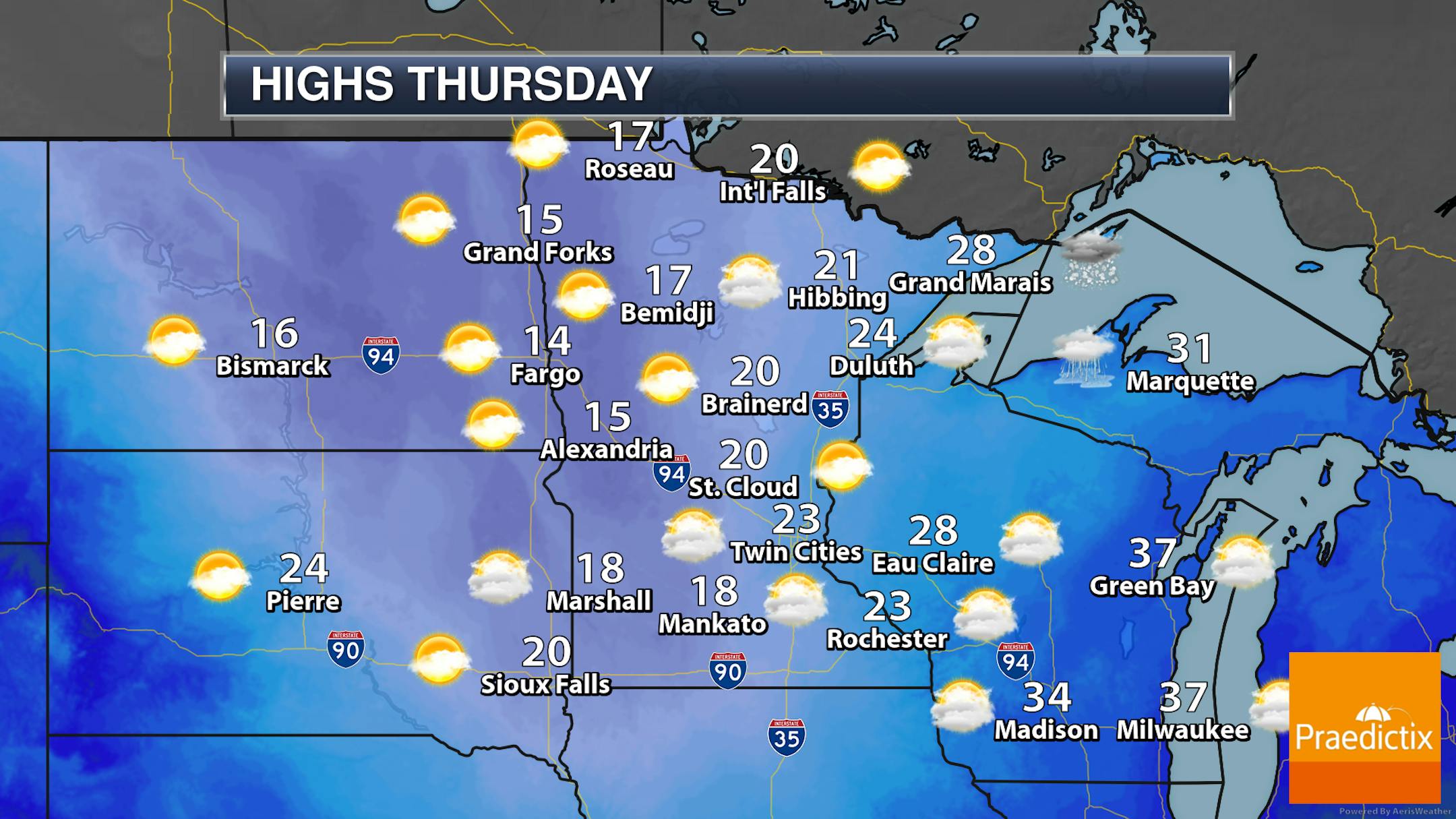 As you head up into northern Minnesota there will more periods of sun vs. across southern parts of the state where cloud cover will stay pretty steady throughout the day. Highs will range from the teens in western Minnesota to the 20s in eastern parts of the state.