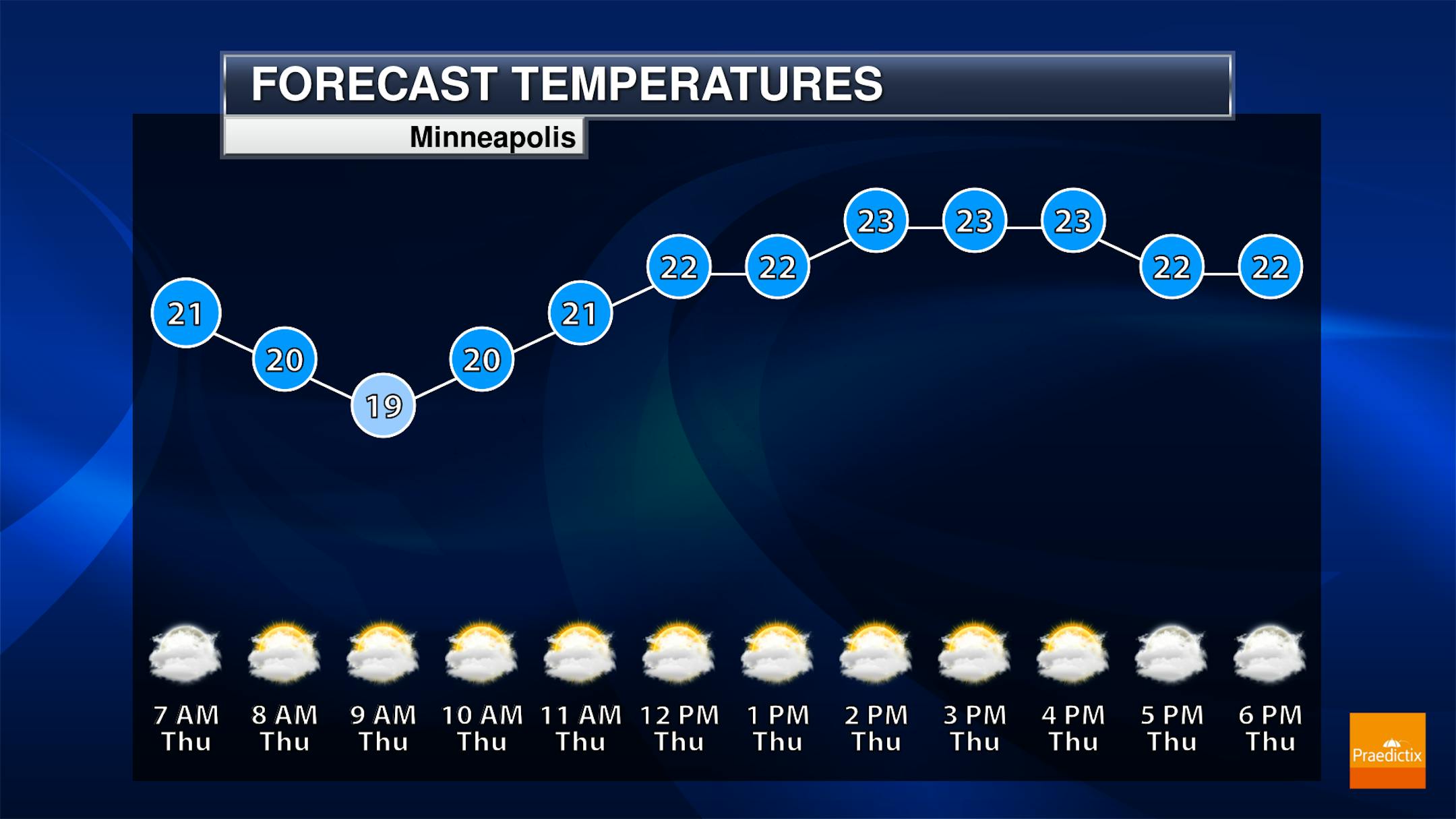 While we were able to get into the 30s behind the freezing rain on Wednesday, it'll be cooler on Thursday with no precipitation to worry about. Temperatures will remain fairly steady in the upper teens to low 20s under mainly cloudy skies for the second to last day of the work week here in the Twin Cities.