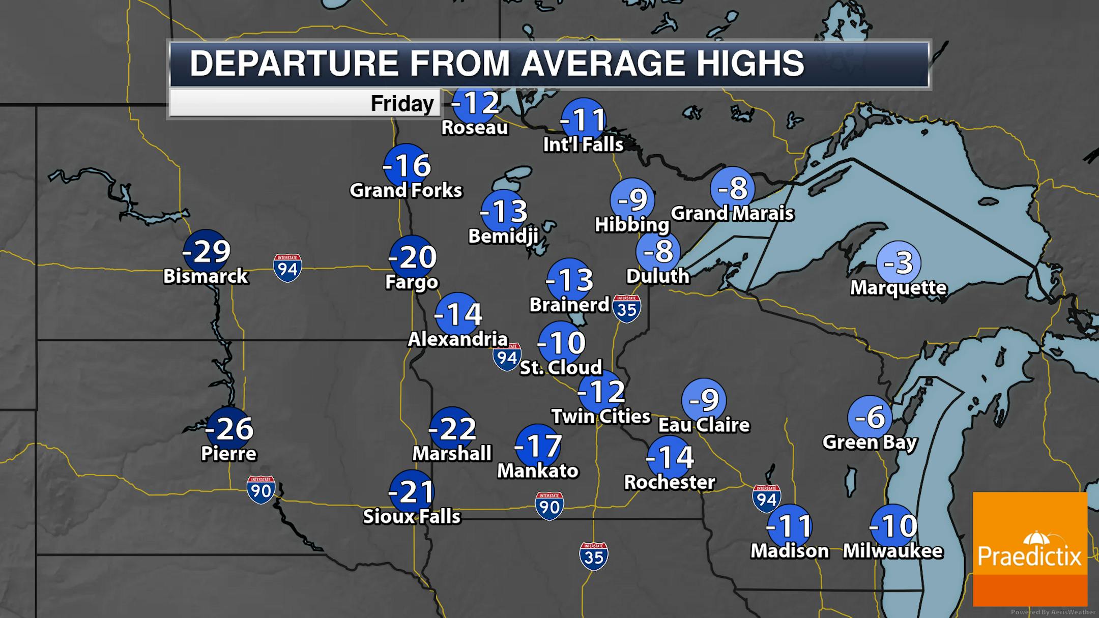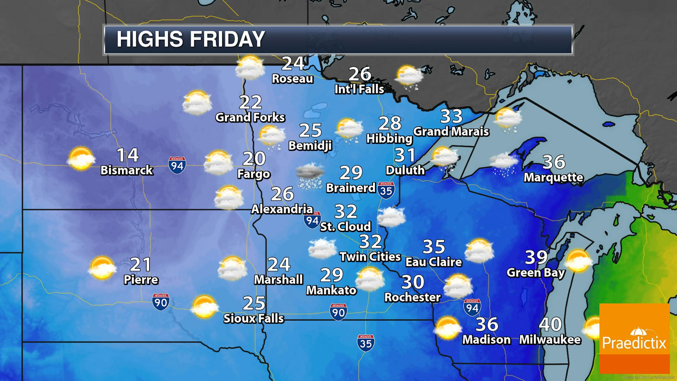 The better chance of some snow showers lingering through the day will be up across northern and central Minnesota - otherwise, it'll be a cloudy and chilly day with highs across the state and western Wisconsin in the 20s and 30s. For snowfall totals on Friday, we can expect maybe an inch or two possible up in far northern Minnesota, with maybe enough to coat the ground and measure as far south as Mille Lacs.