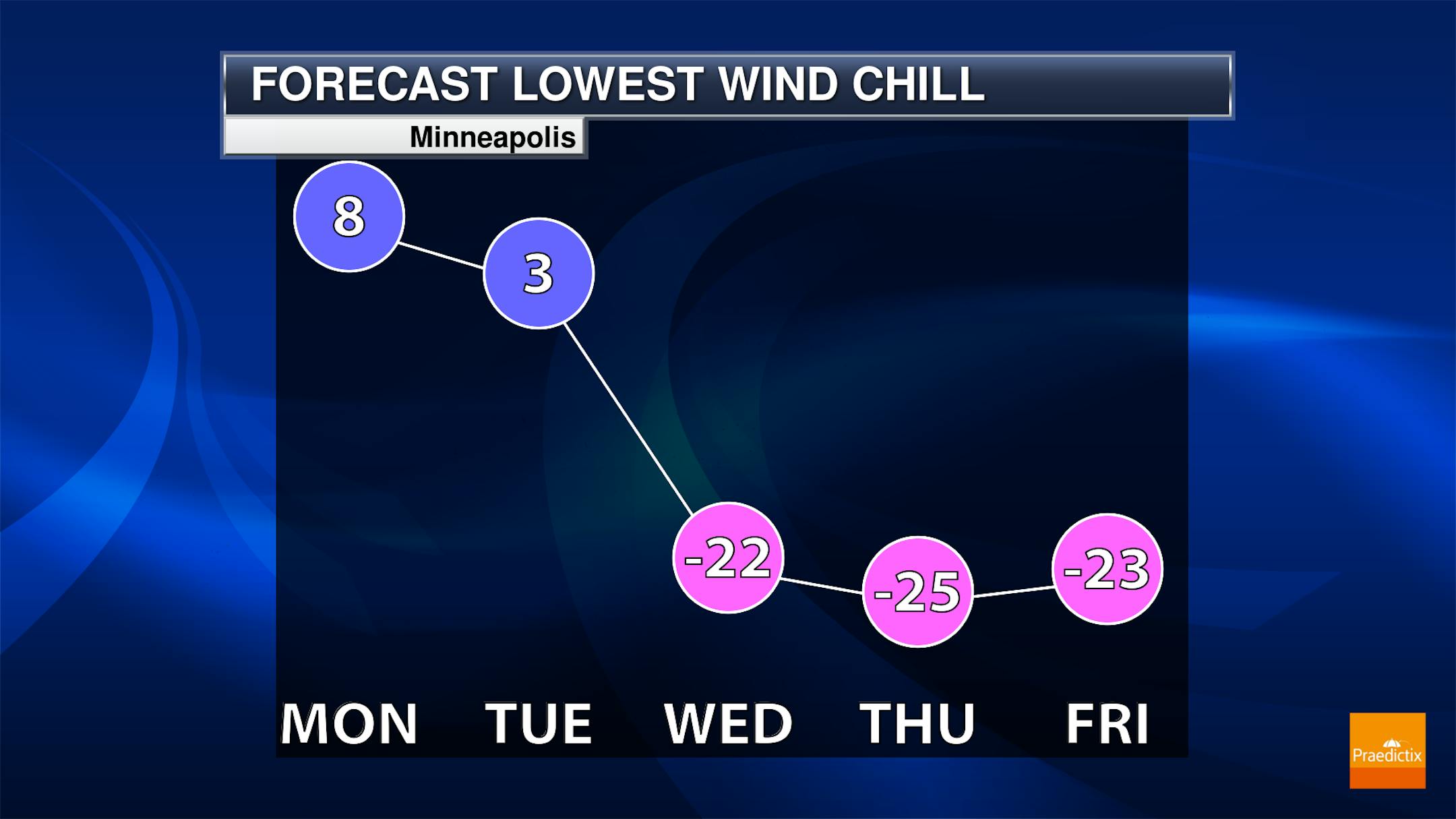 And with that colder weather will come subzero lows and, as shown on the graphic above, bitterly cold wind chills once again down between at least -20F and -25F for the morning hours on Wednesday, Thursday, and Friday.