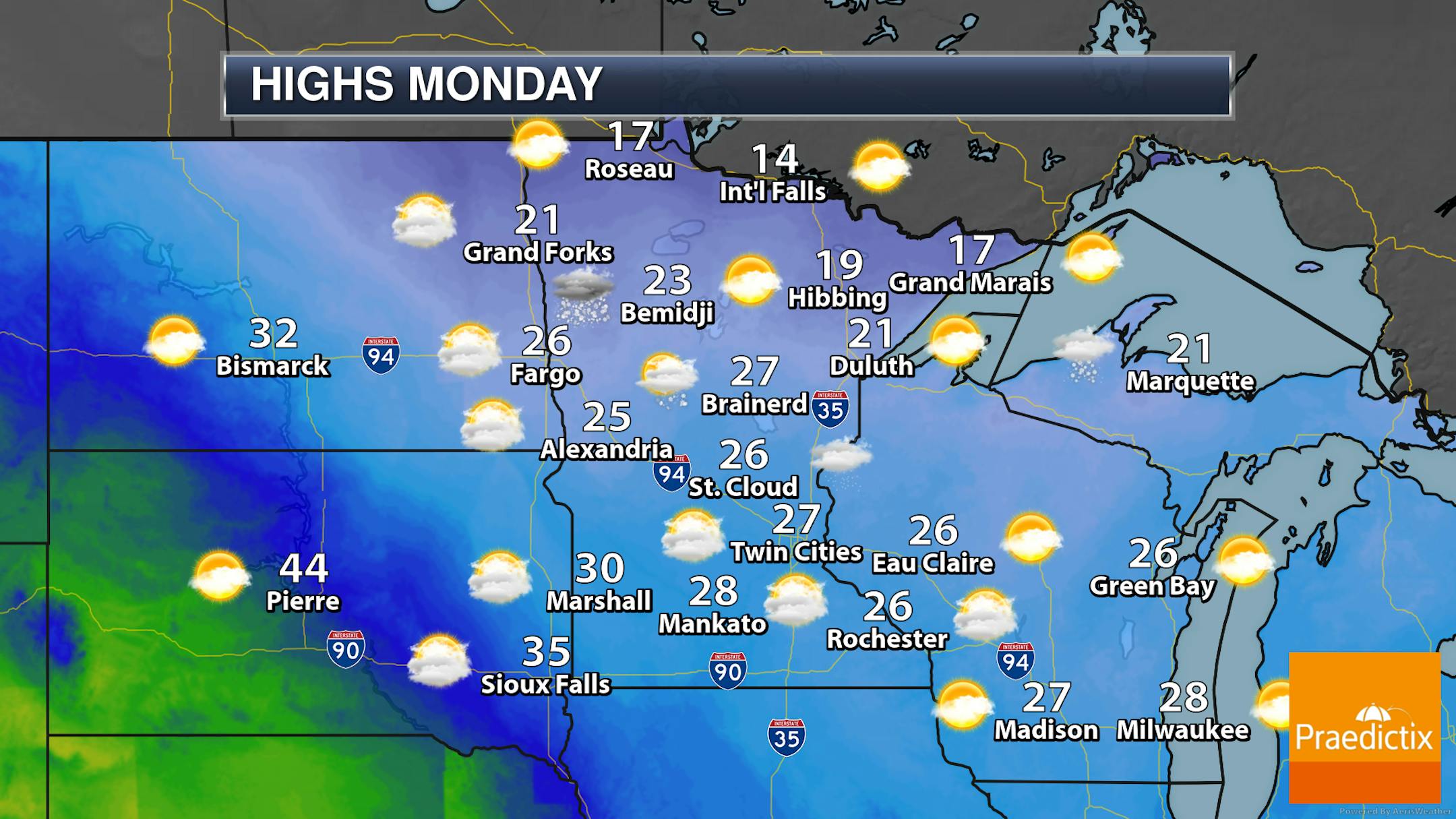 Much of the same is expected across the state with mainly cloudy skies and again that light snow or flurry chance across central Minnesota, mainly during the morning and midday hours. Highs will range from the teens near the International Border to the low 30s in southwestern Minnesota.
