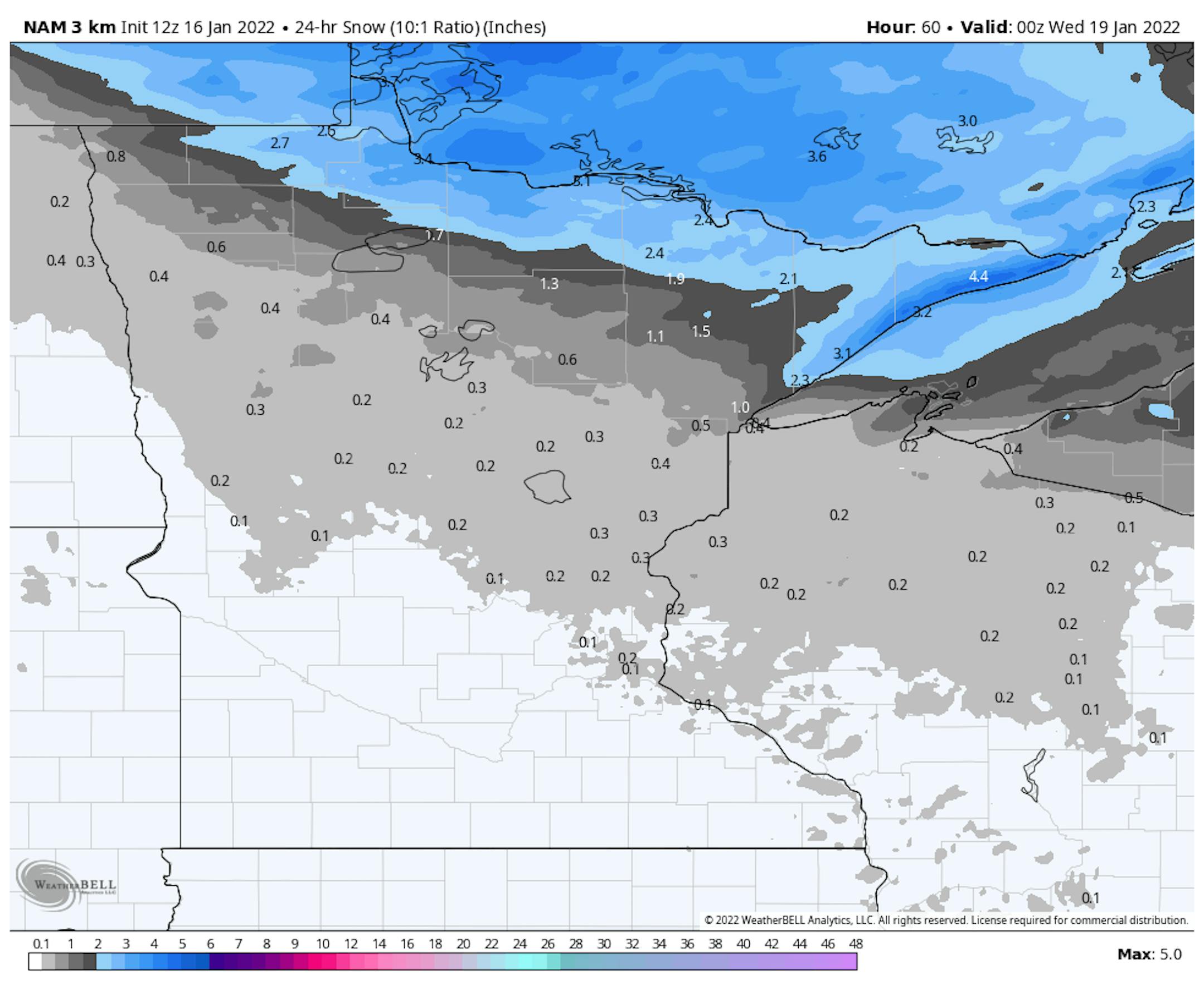 Forecast snow from 6 PM Monday to 6 PM Tuesday. WeatherBell/NWS