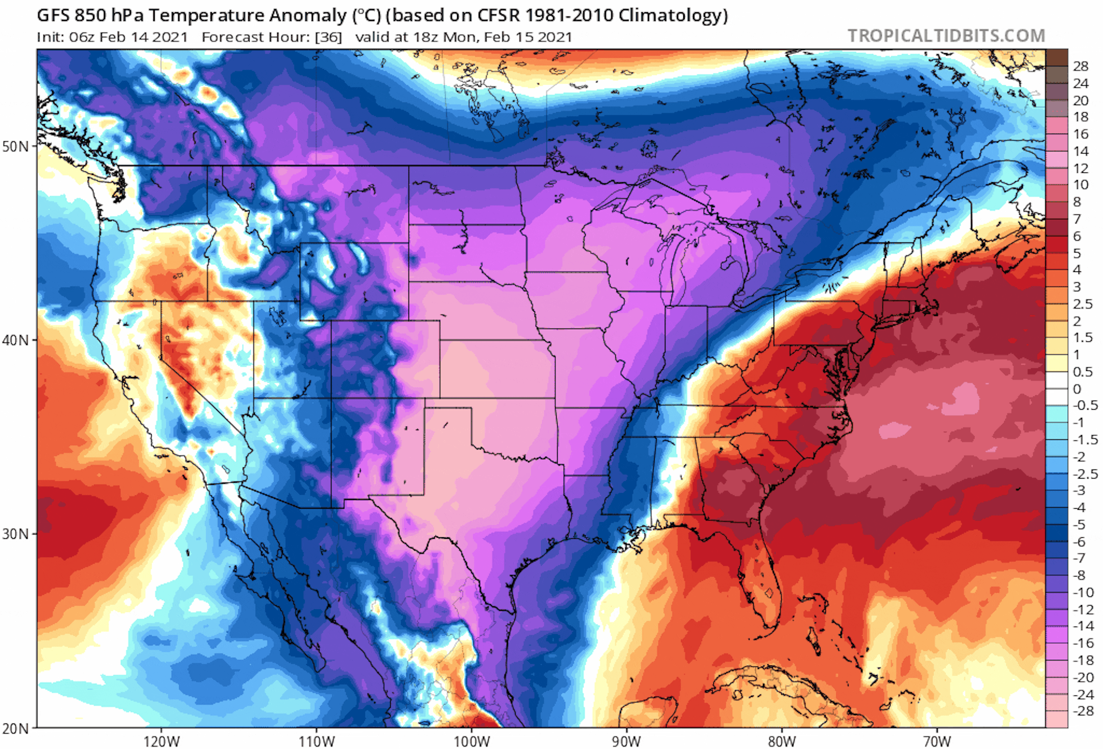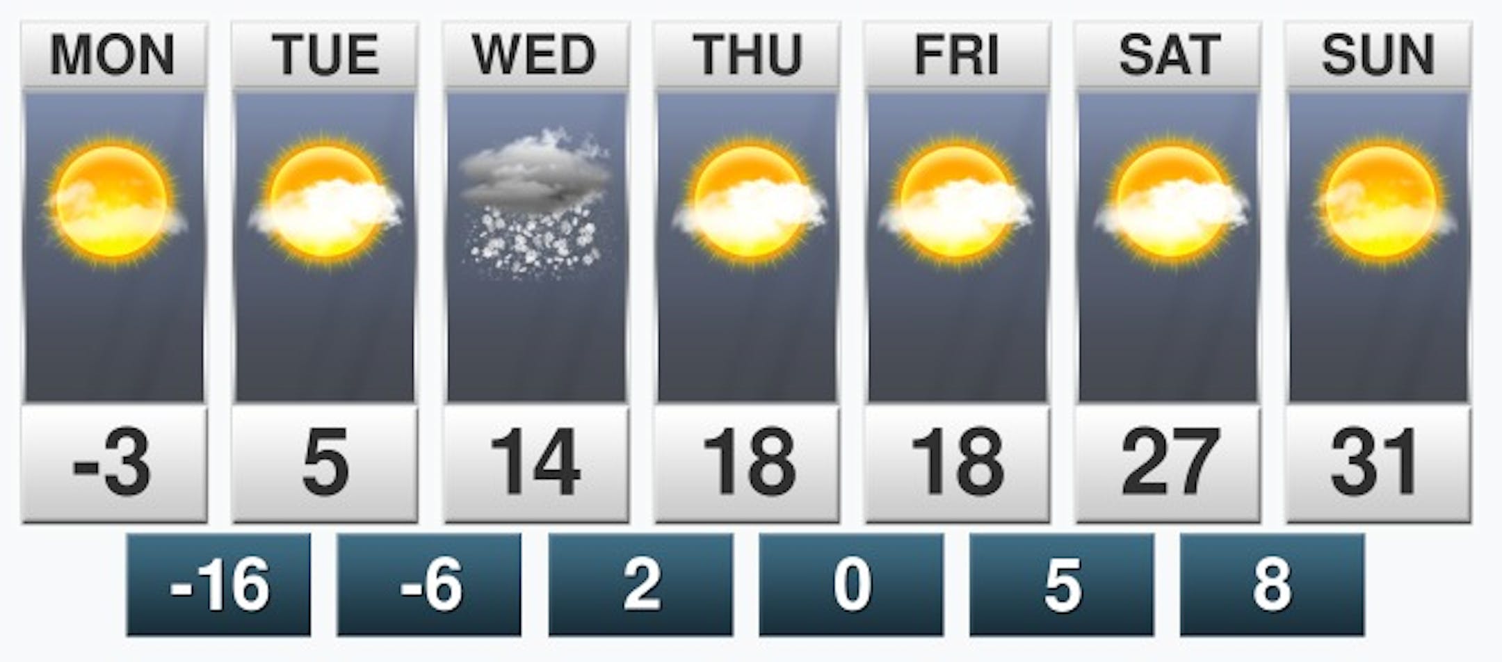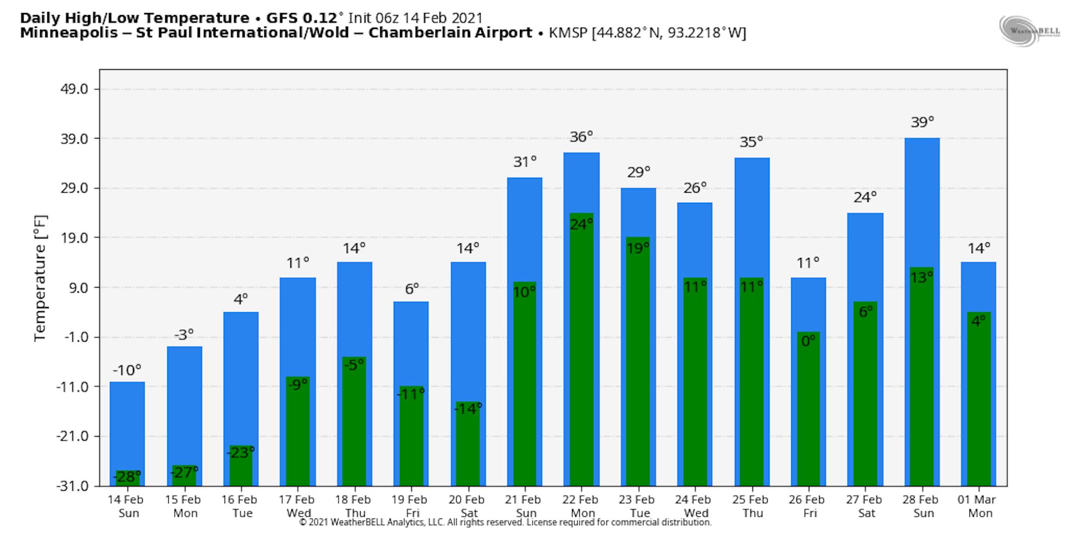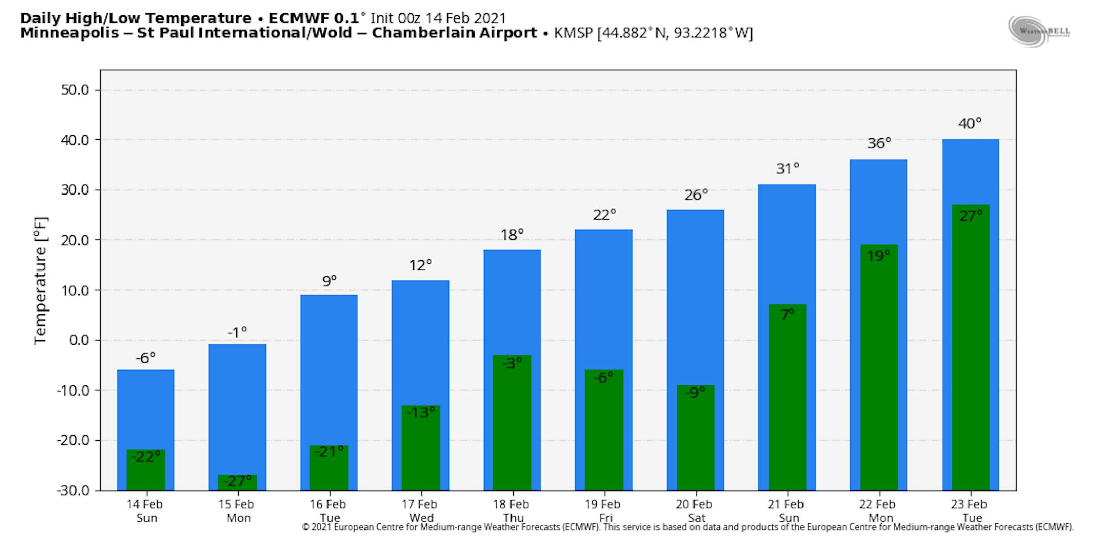 Here's the extended weather outlook for Minneapolis through the end of next week. Note that temperatures will stay VERY chilly during the first half of the week with readings running nearly -15F to -35F below average. The good news is that there will be some improvement during the 2nd half of the week as highs warm into the teens above zero for the first time since February 5th. Highs could warm into the 20s and 30s next weekend, which will be some +50F warmer than it was on Sunday and Monday morning!