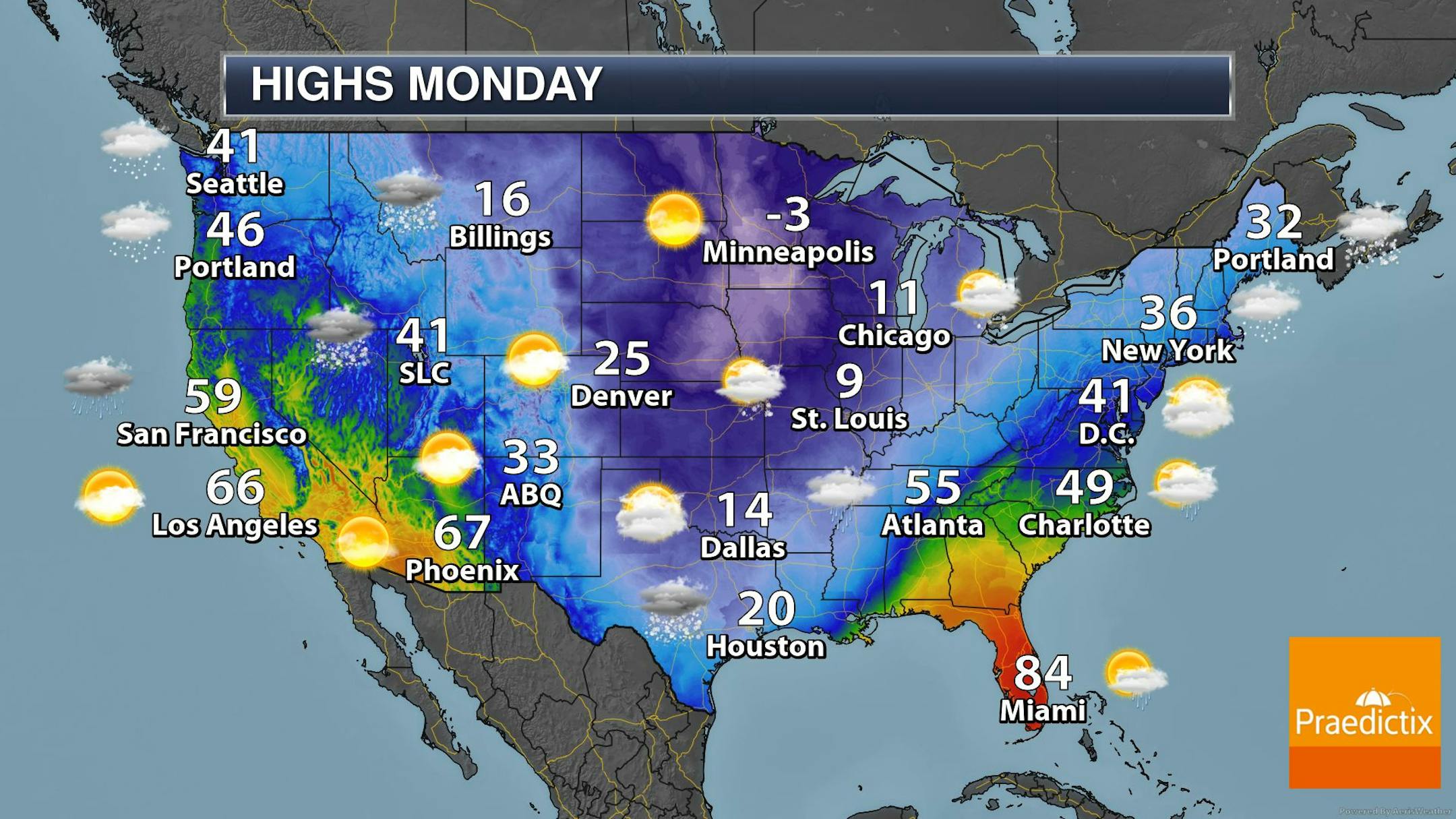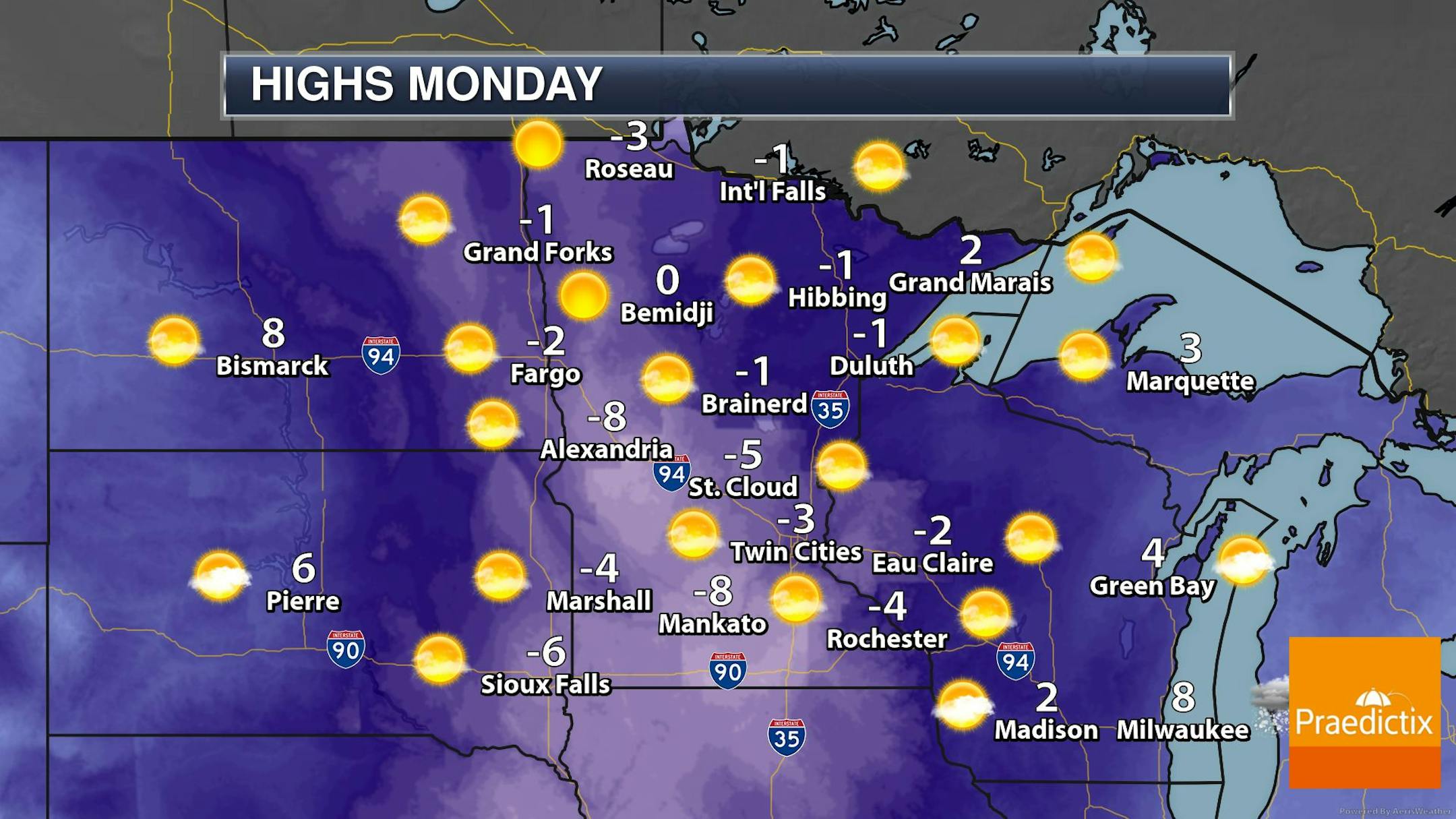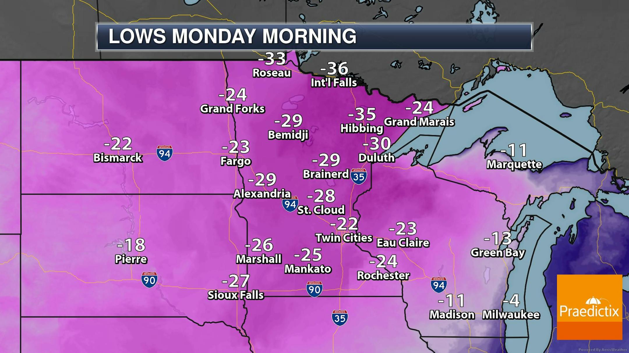 Here's the weather outlook across the region for Monday, which shows temperatures running well below average. Many locations will be nearly -25F to -35F below normal with most locations not warming above zero.