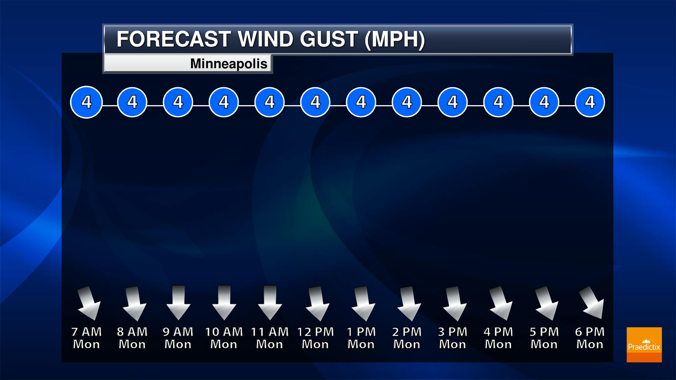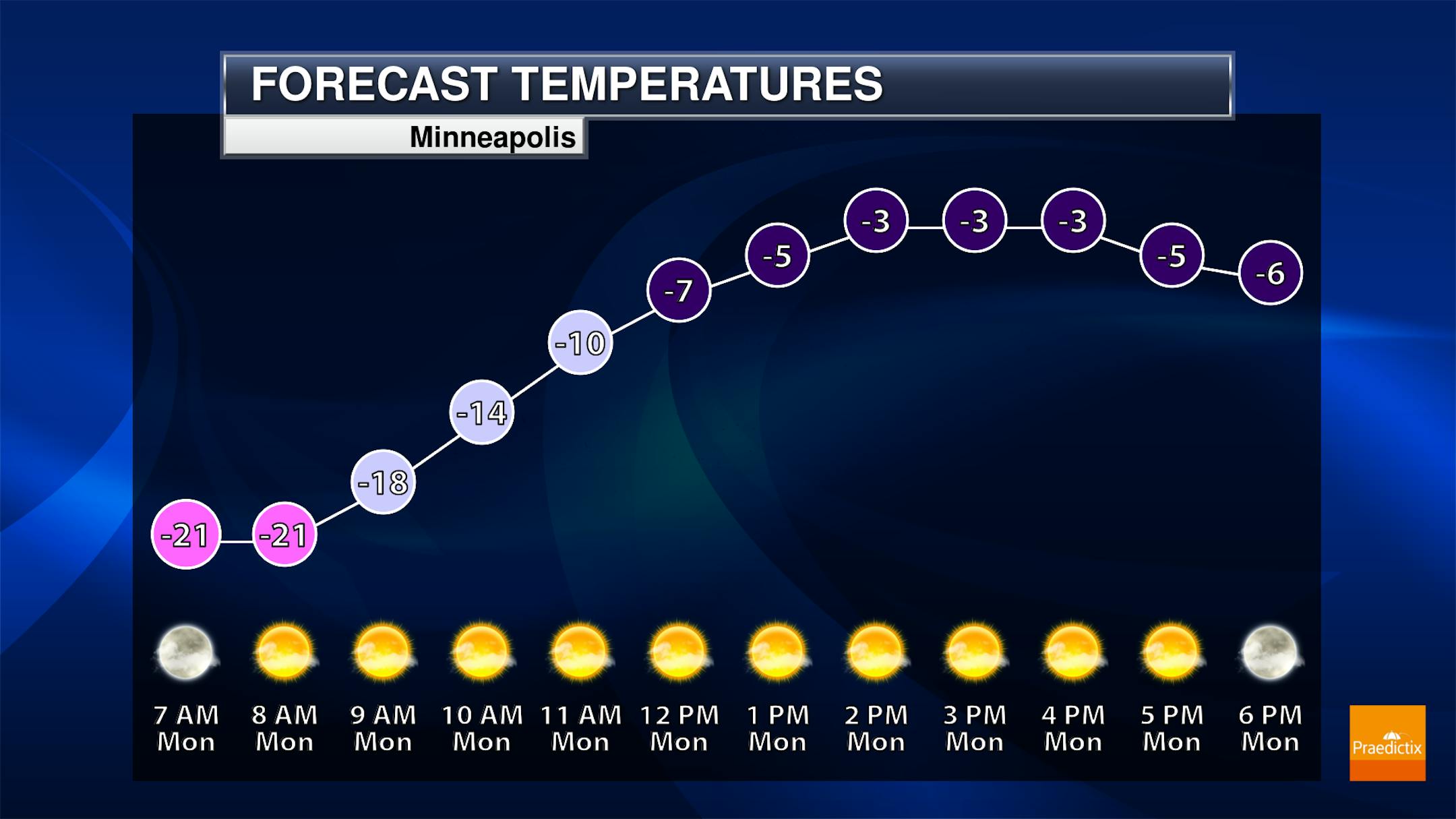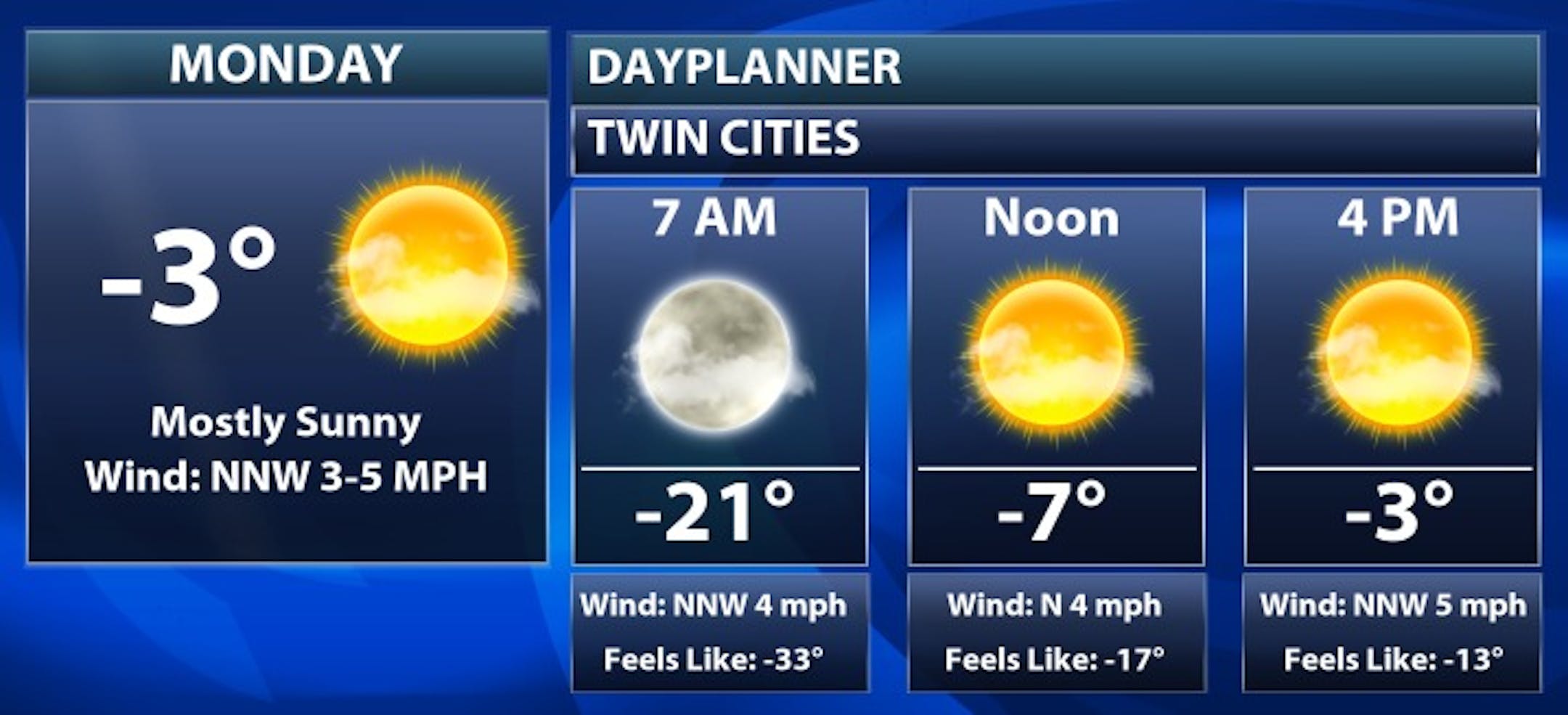 Here's the weather outlook for Minneapolis on Monday. It'll be another cold day with highs struggling to get above 0F by the afternoon. Northwesterly winds at 5-10mph will keep wind chill values in the subzero range all day.