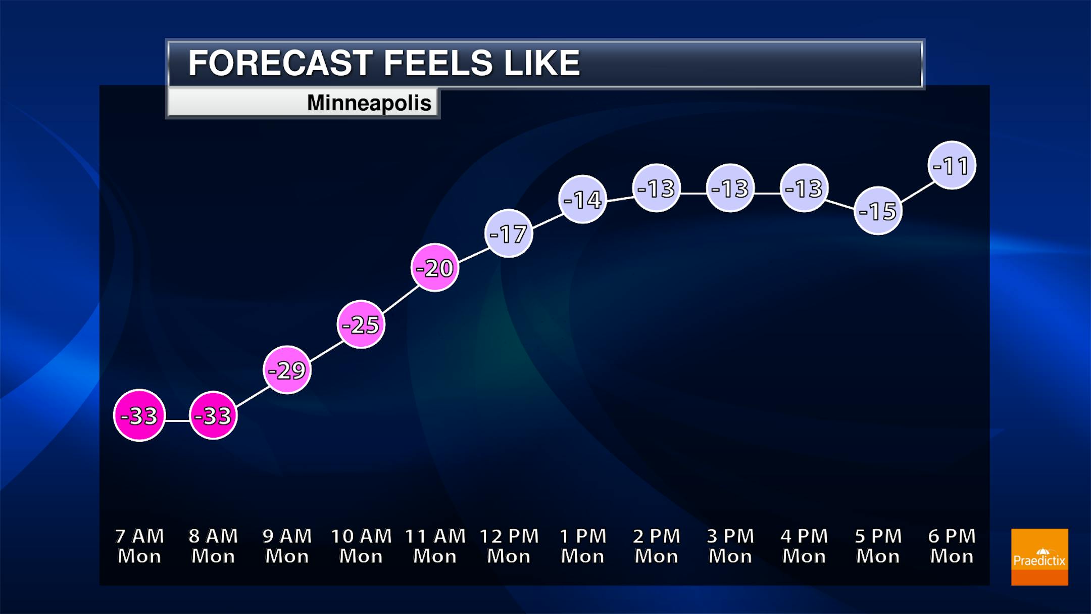 The meteograms for Minneapolis on Monday show very cold conditions through the day with feels like temps staying in the teens below zero. The actual air temperature may climb to near 0F, but the NW wind of 10mph to 15mph through the day will make it feel even colder.