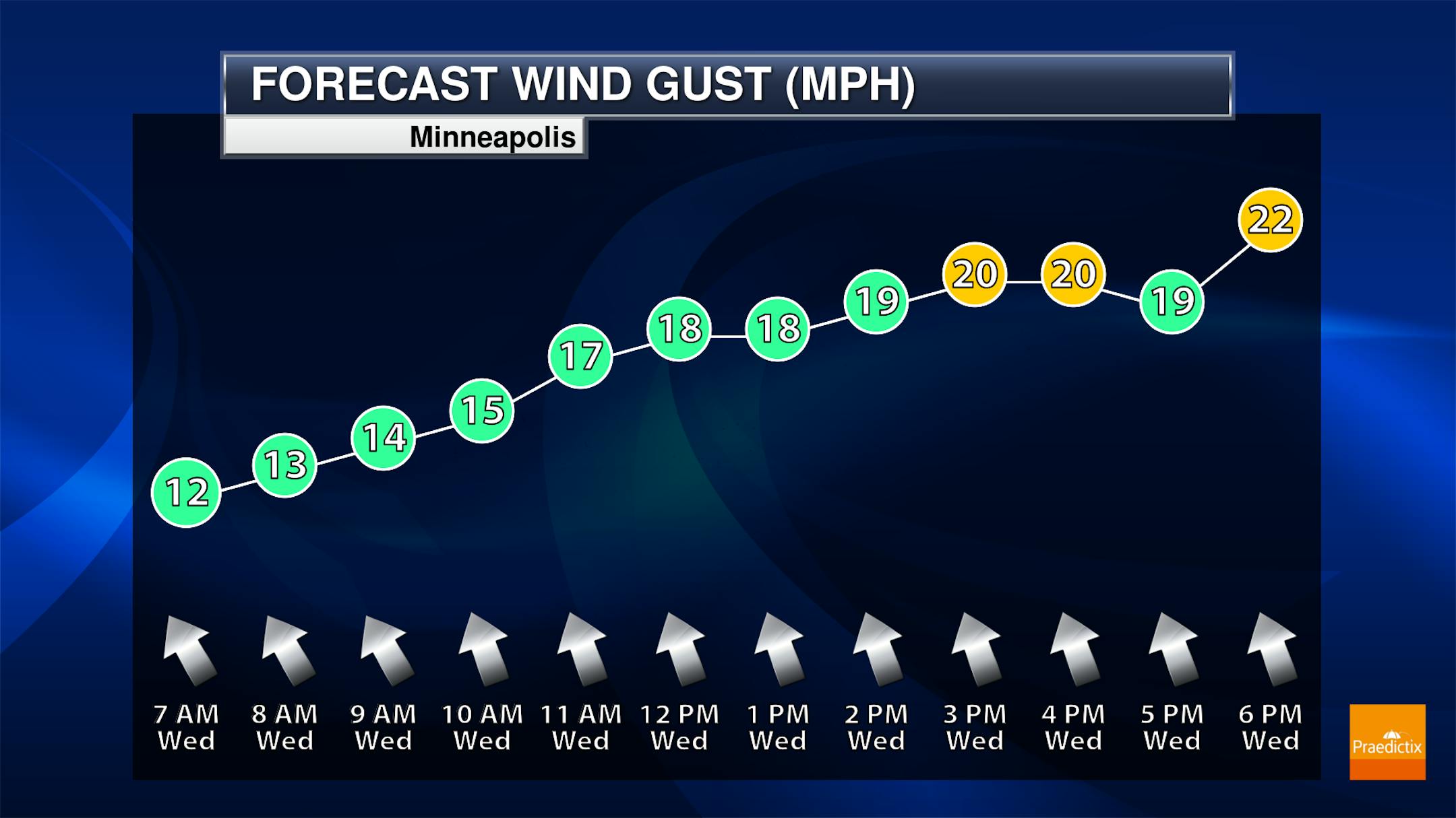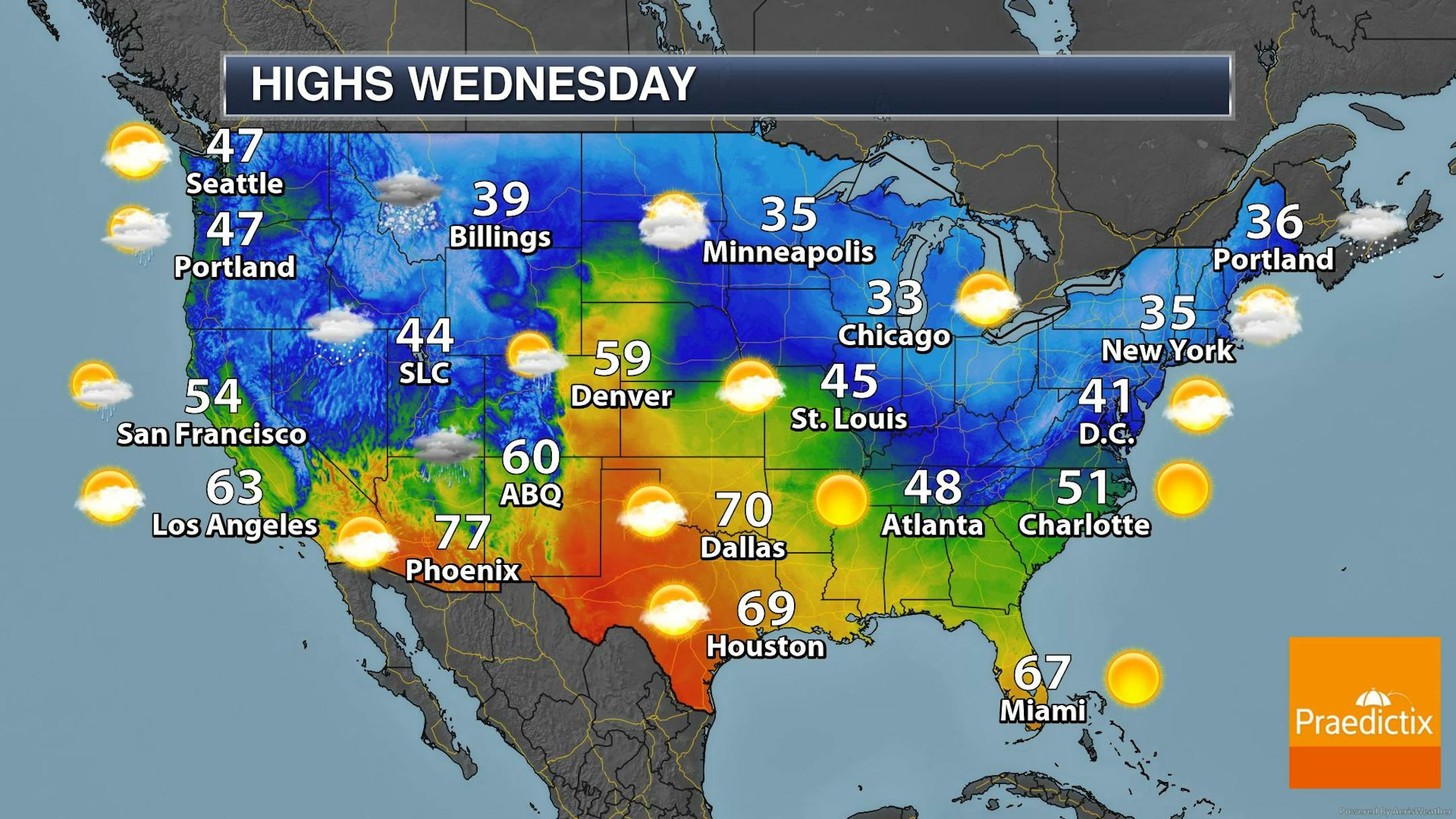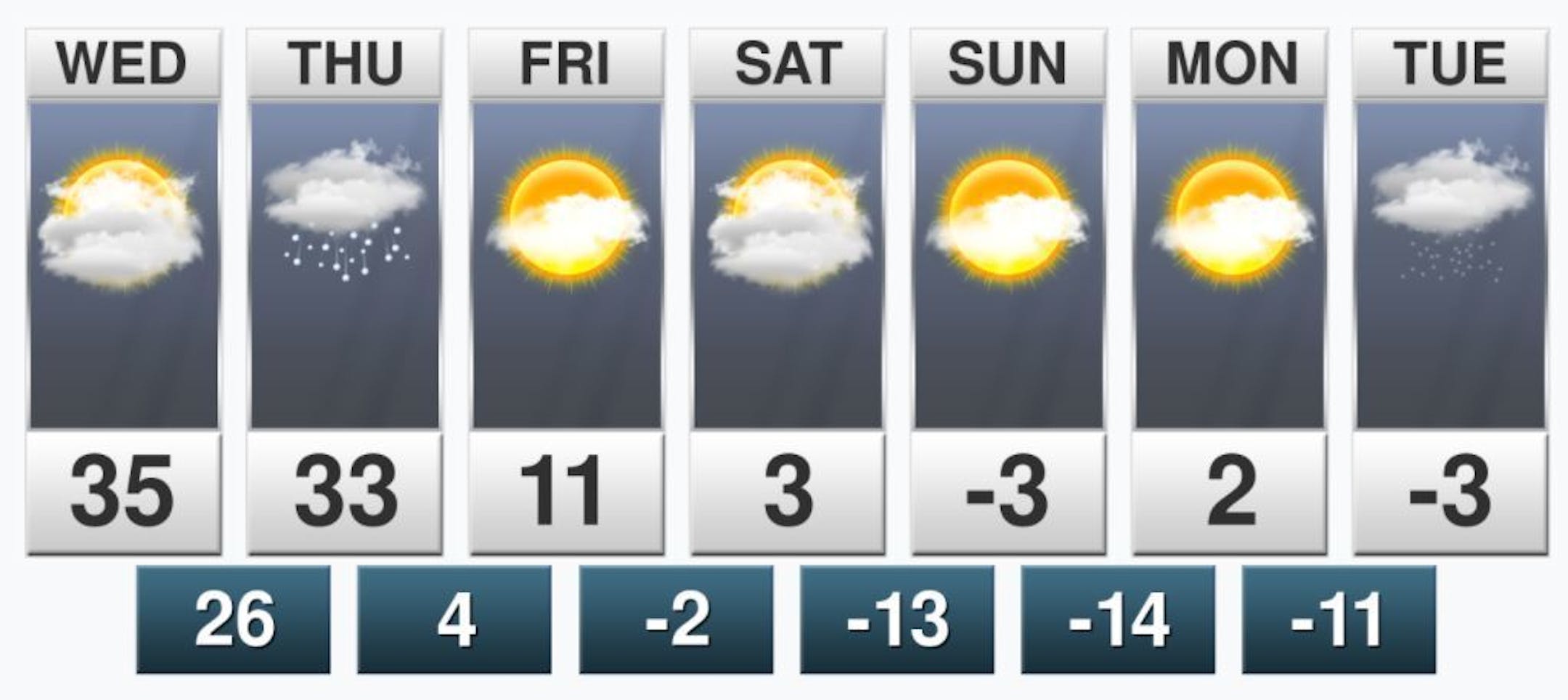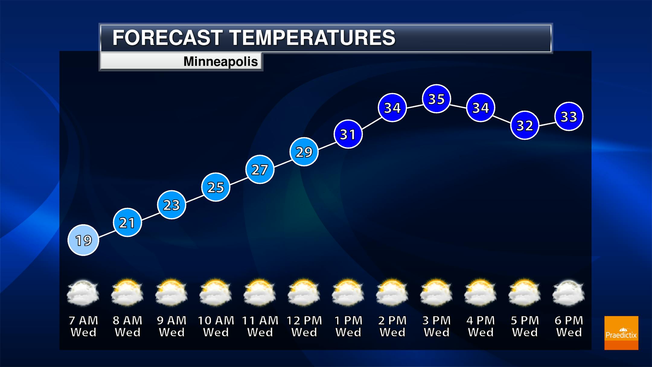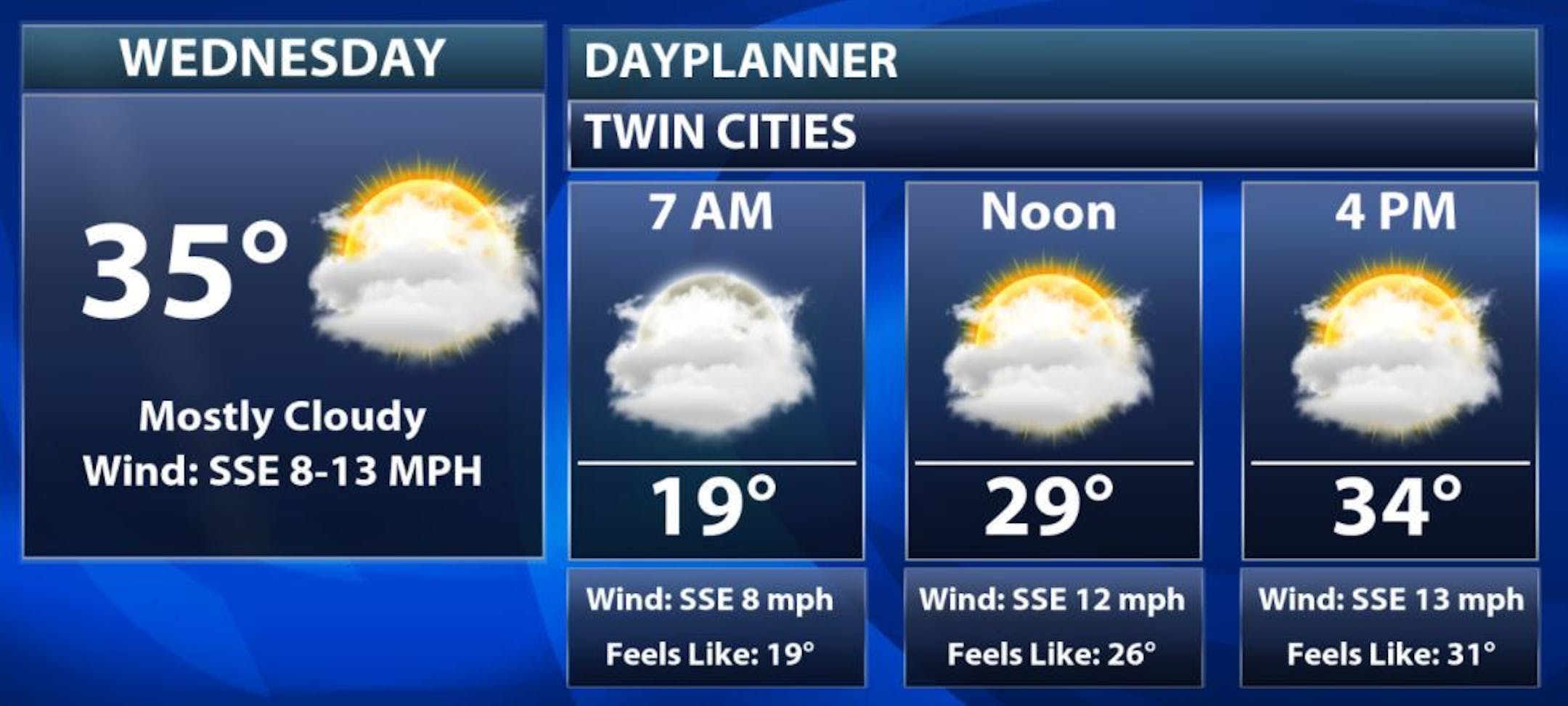 Here's the weather outlook for Wednesday, which shows another mild day in place with temps warming into the low/mid 30s under mostly cloudy skies. Winds will be a bit stronger through the day with gusts approaching 15-20mph during the afternoon.