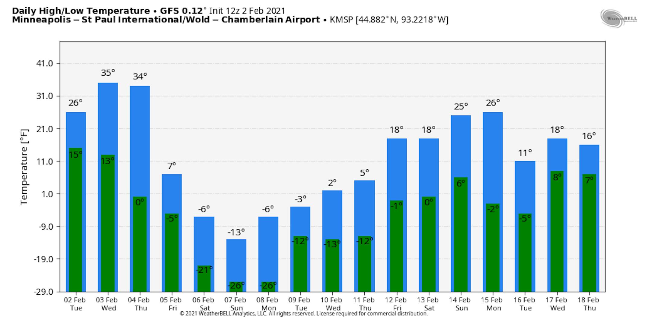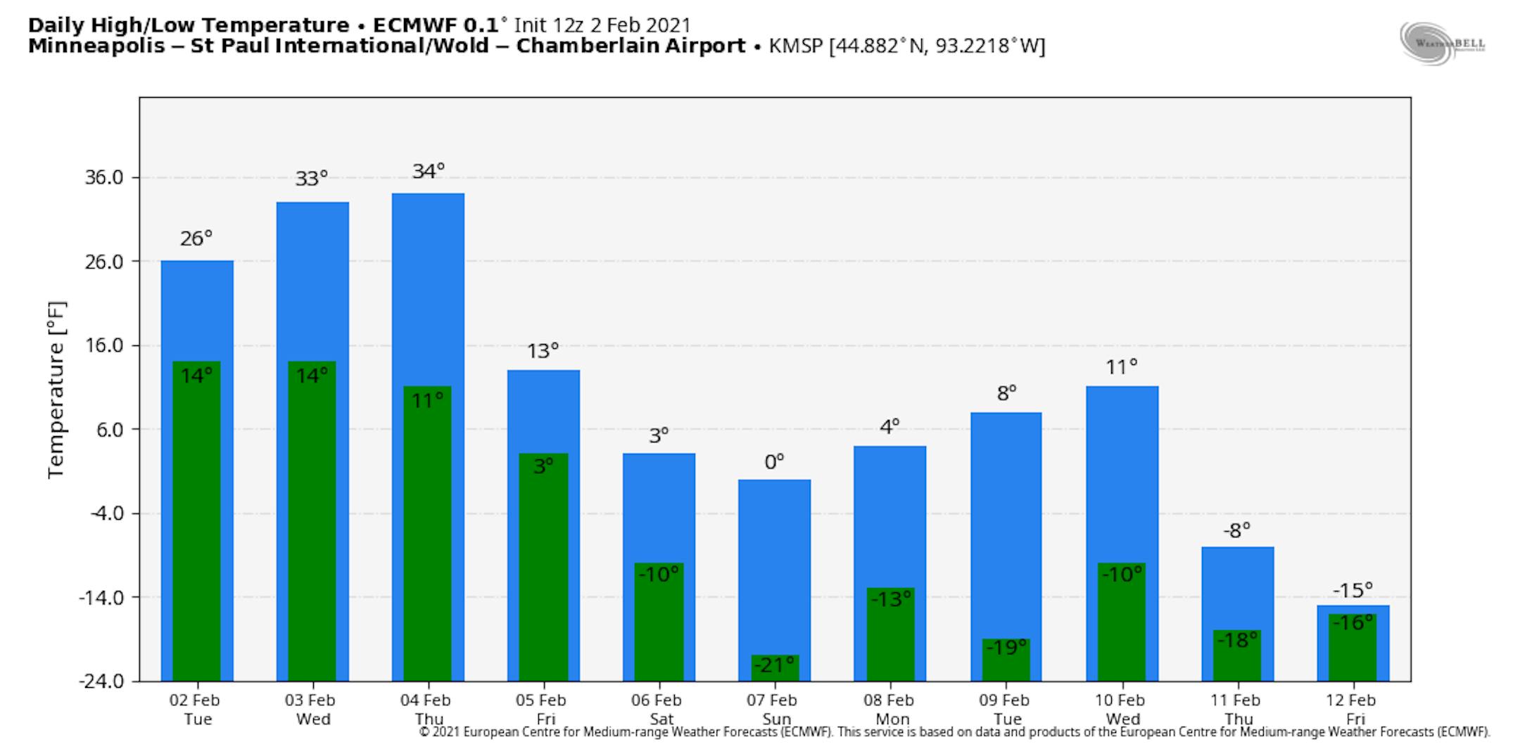 Here's the extended weather outlook for Minneapolis through the weekend and into early next week. Note that temperatures will really plummet with high temperature possibly not getting above 0F for the first time since late January 2019. Low temperatures on the other hand could dip to -10F for the first time since February 2020. By the way, the last time we dropped to -20F or colder was at the end of January 2019 as well.