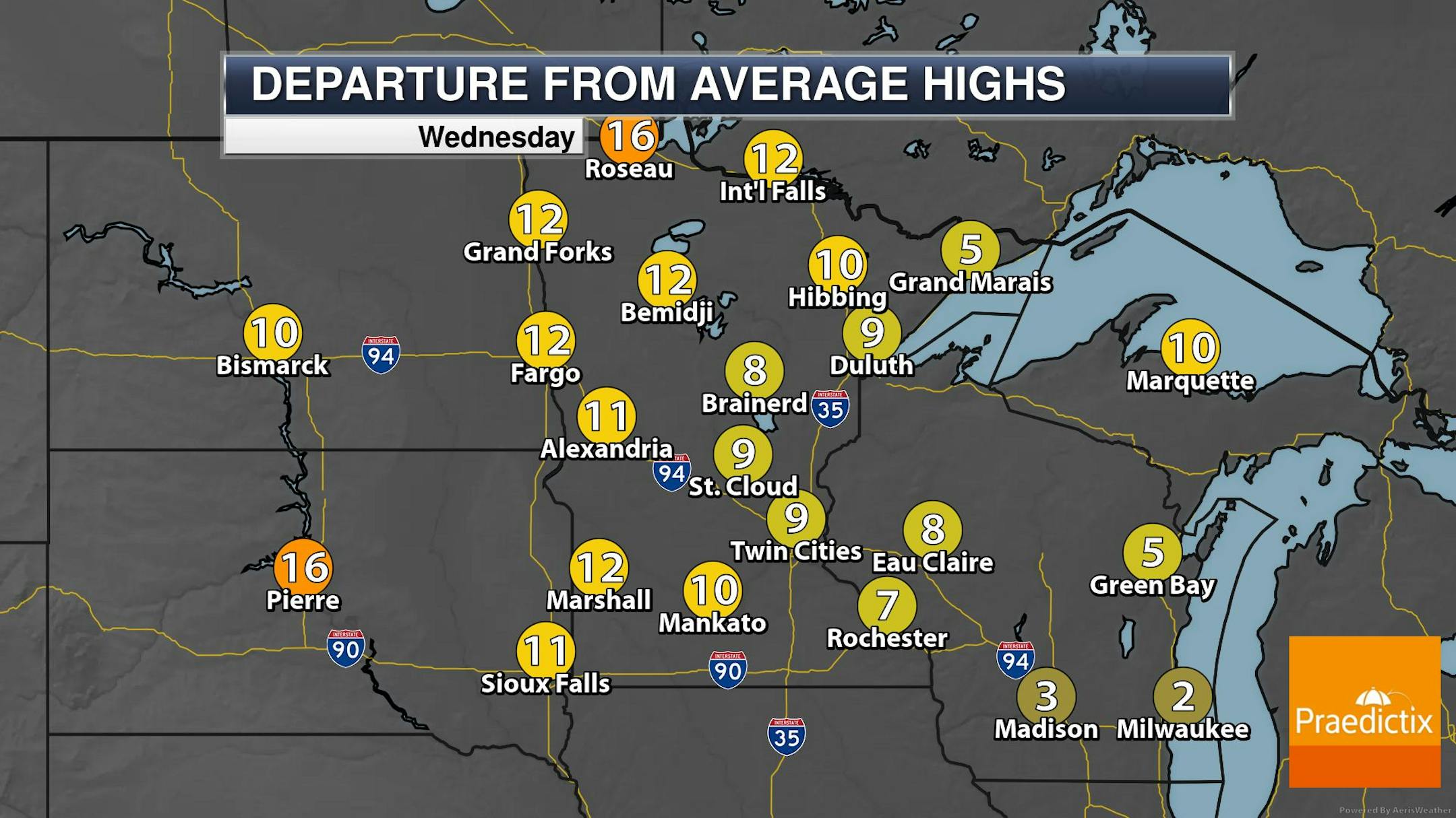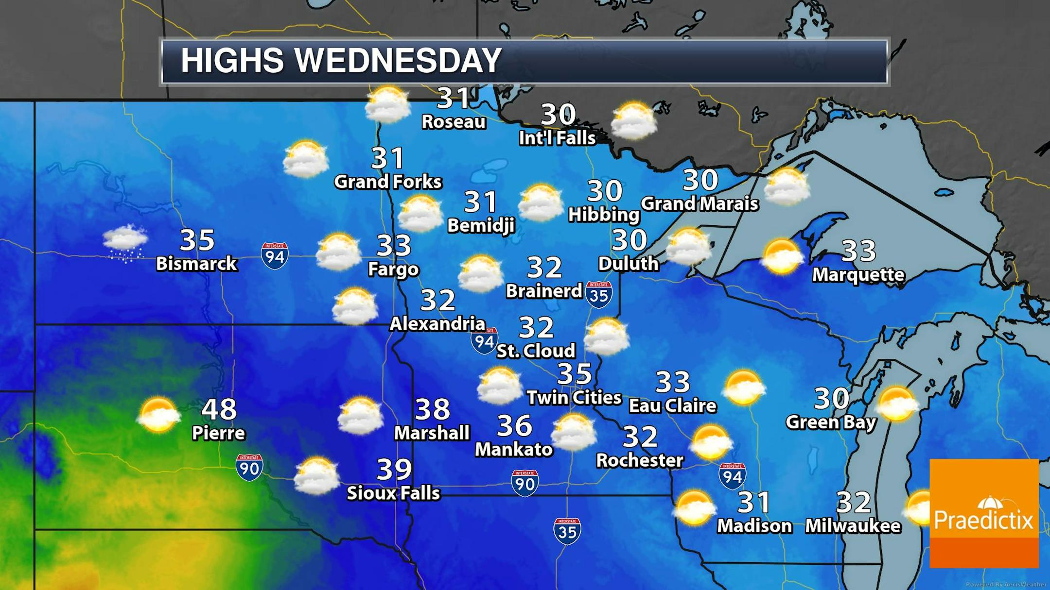 Here's a look at weather conditions across the region on Wednesday, which shows very mild temps in place for the early part of February. Many locations should warm into the 30s, which will be nearly +10F to +15F above average across the state o Minnesota. Interestingly, Pierre, SD could warm close to 50F on Wednesday!