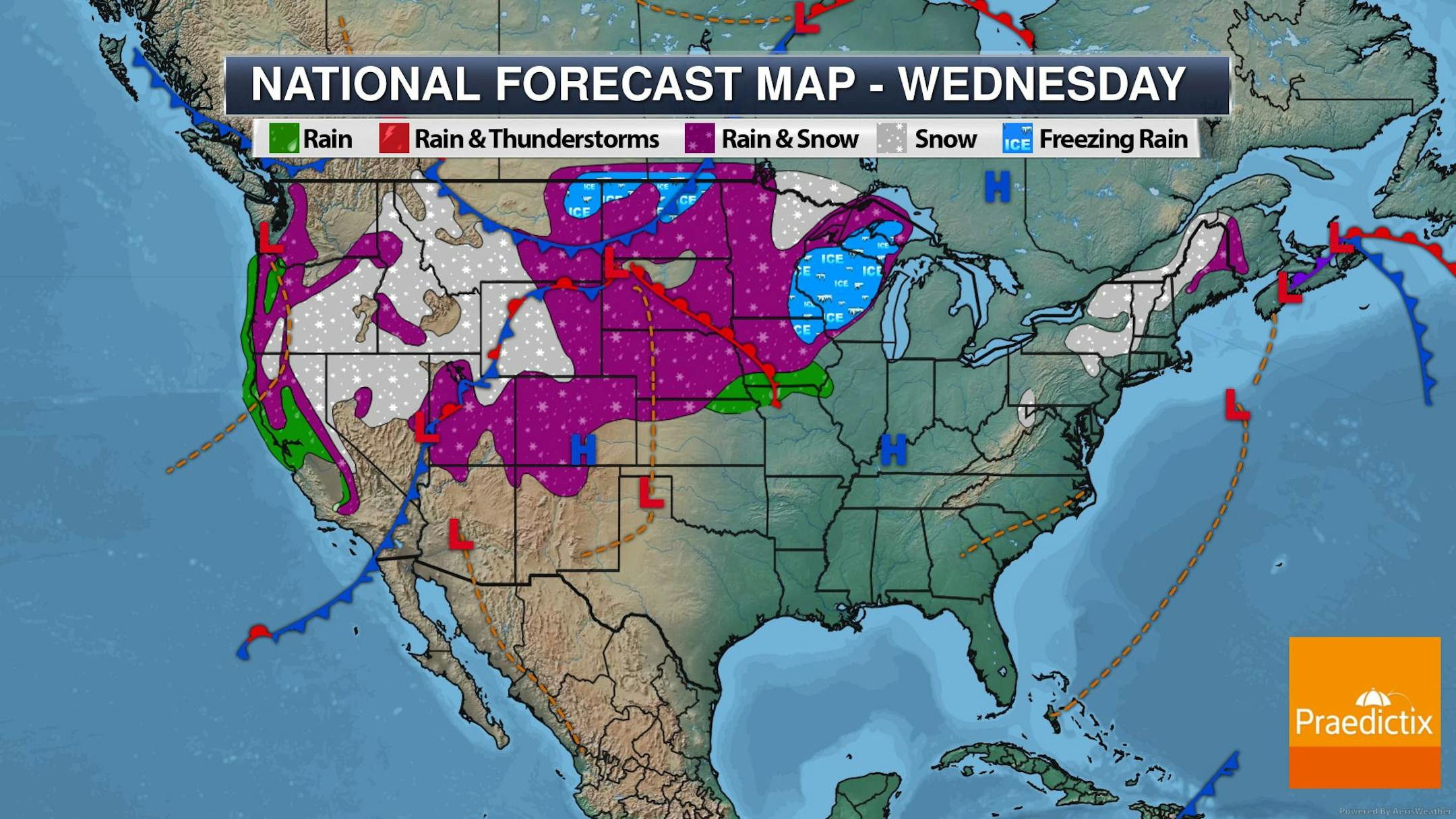 Here's the weather outlook from midday Wednesday to Midday Friday, which shows an Arctic front plowing through on Thursday with wind-whipped snowflakes an minor snow accumulations across parts of the state. Heavier snowfall tallies will be found east of the Mississippi River Valley and into northern Wisconsin and the U.P. of Michigan.