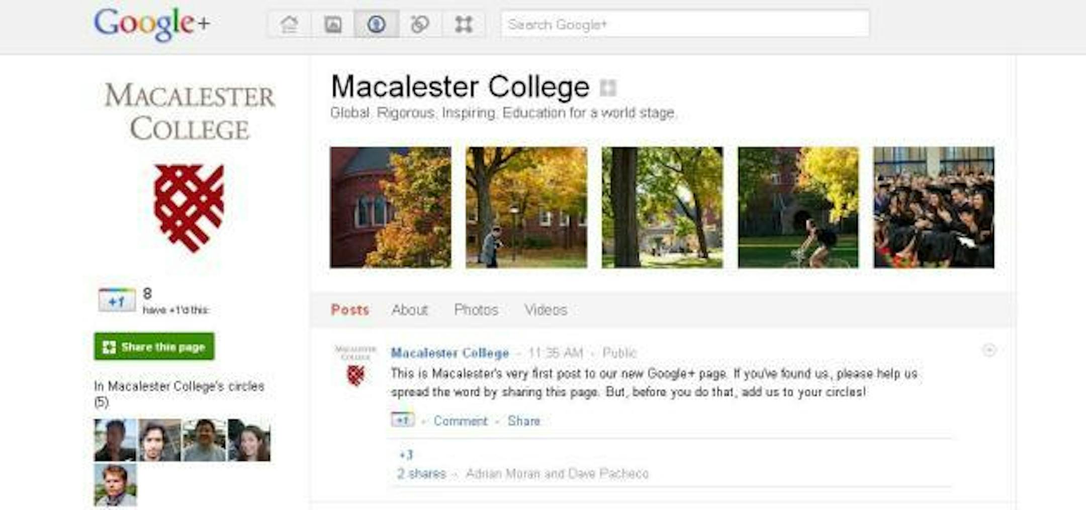 Macalester College, in St. Paul, announced its page via Twitter on Tuesday. "We're new to Google+," Carleton College said in its first post, "so be patient with us while we explore the neighborhood. :)" With 52 followers, Augsburg College might have the beefiest page, so far.