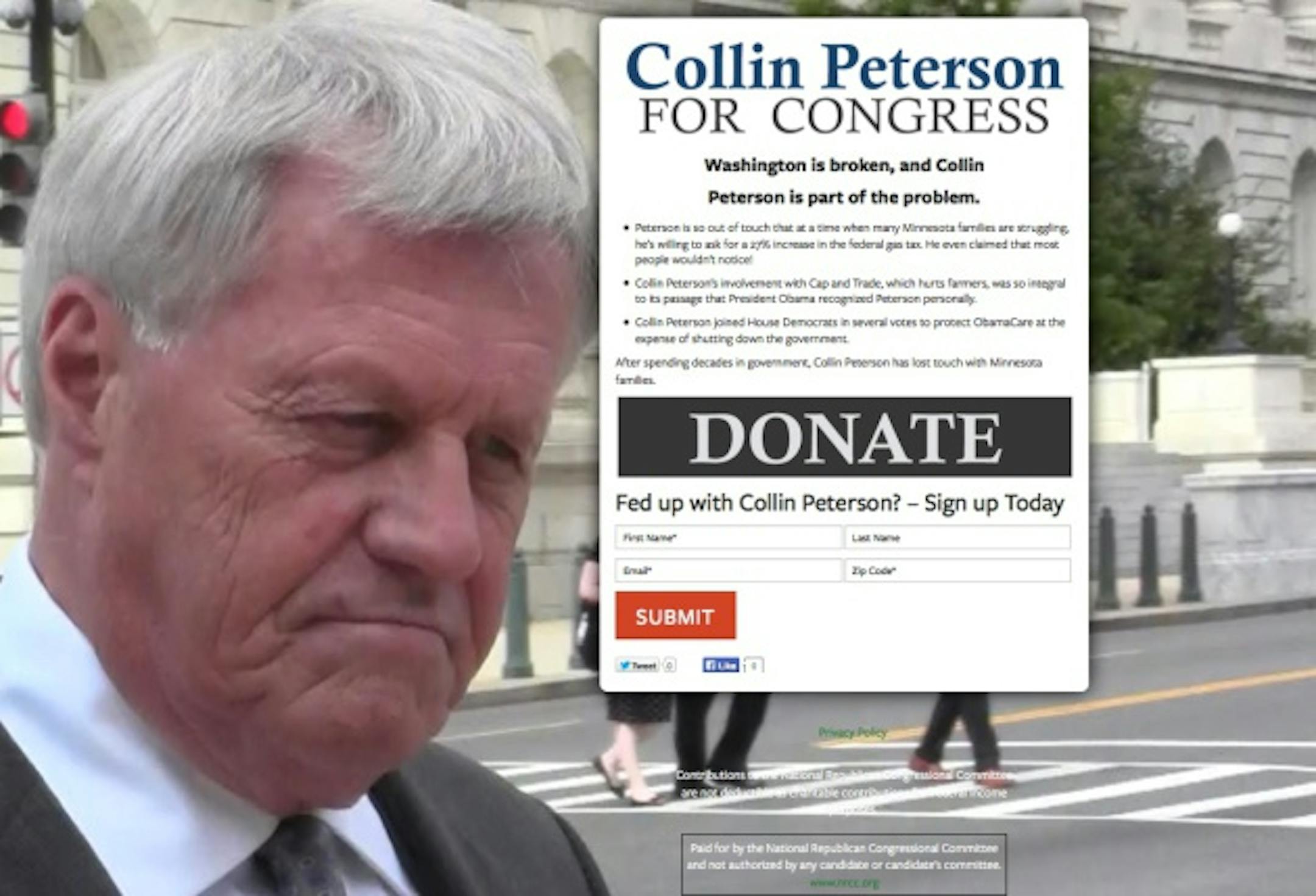 But in smaller type it says, "Washington is broken, and Collin Peterson is part of the problem" and if visitors click the "donate" button the site will take them to a NRCC website.