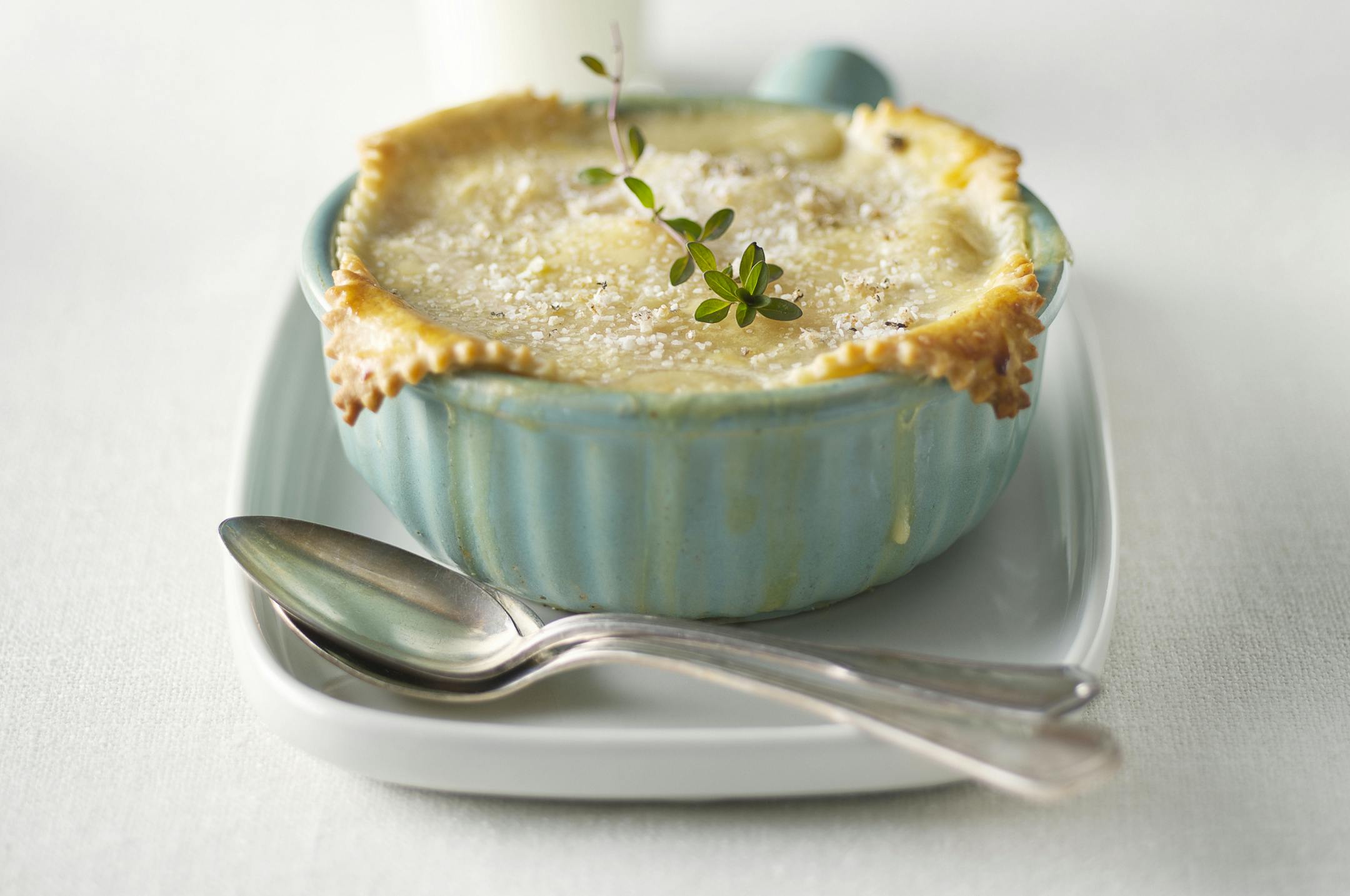 Something starchy. A short pie-pastry crust, flaky puff pastry (from the freezer aisle is fine), rolled or cutout biscuits, or plain-old dumpling dough will do the trick. I'm not a fan of crust-lined pies; it's too much dough. I think a good topper pastry or biscuit is nicest, but it depends on your preference. And there's always the option of a creamy mound of mashed potato — russet or sweet — as a topper.