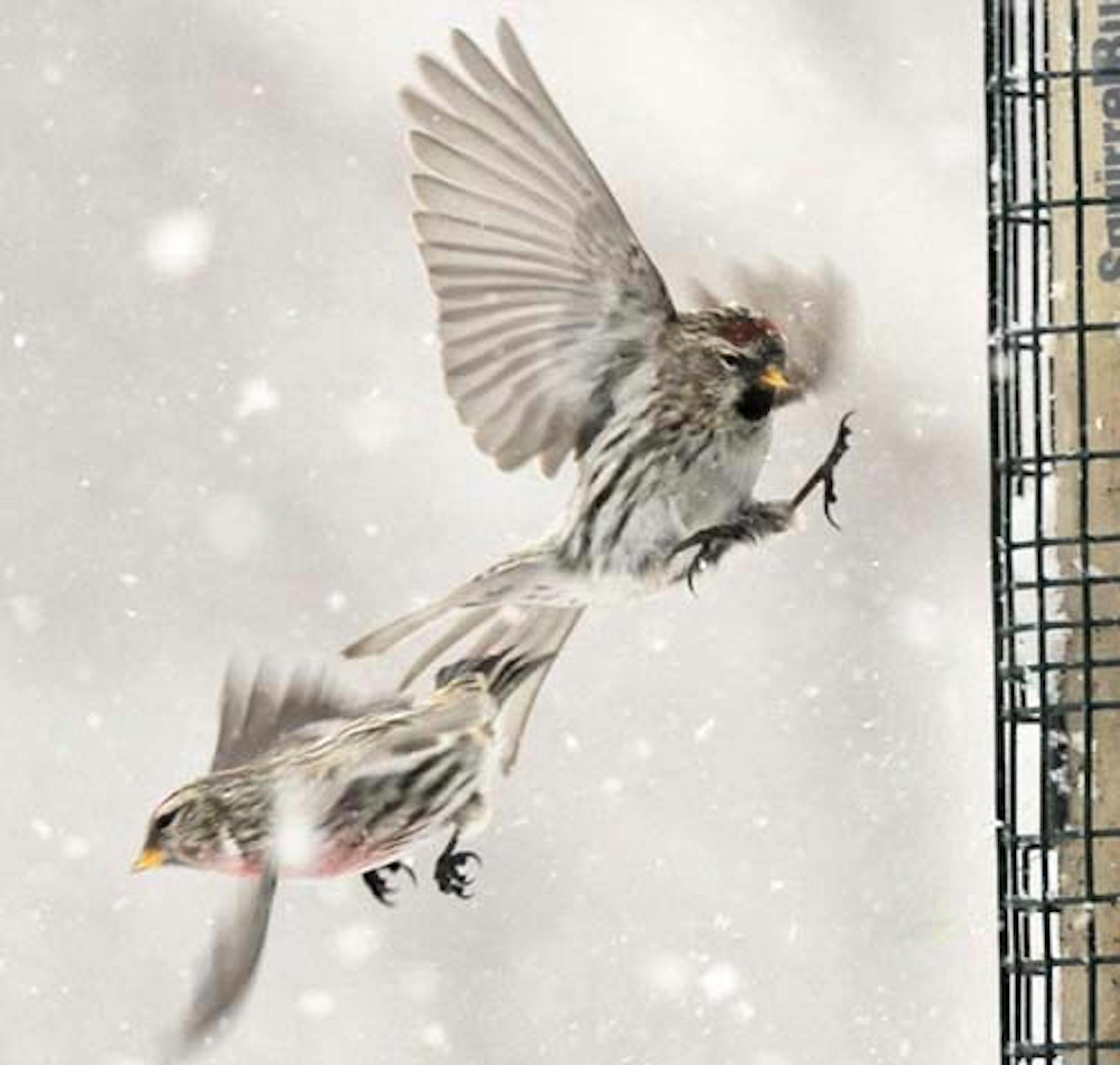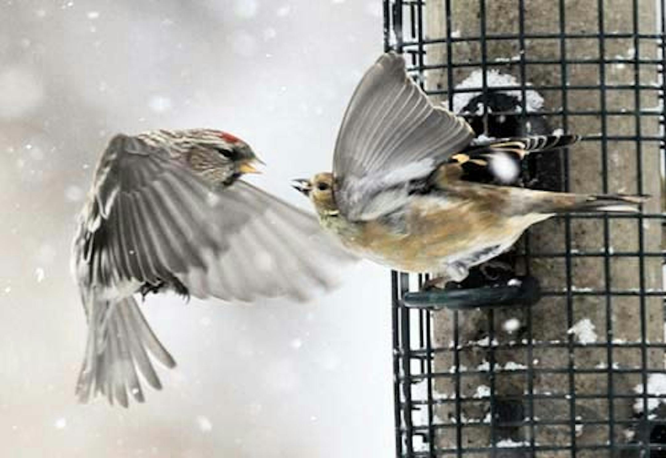 Common Redpolls have been at our feeders this week, sometimes three, sometimes six. l've seen a few reports of this species at other Twin Cities feeders. This species comes from the north on an irregular basis. As you can see, the American Goldfinches, regular here year-round, are possessive about the food.