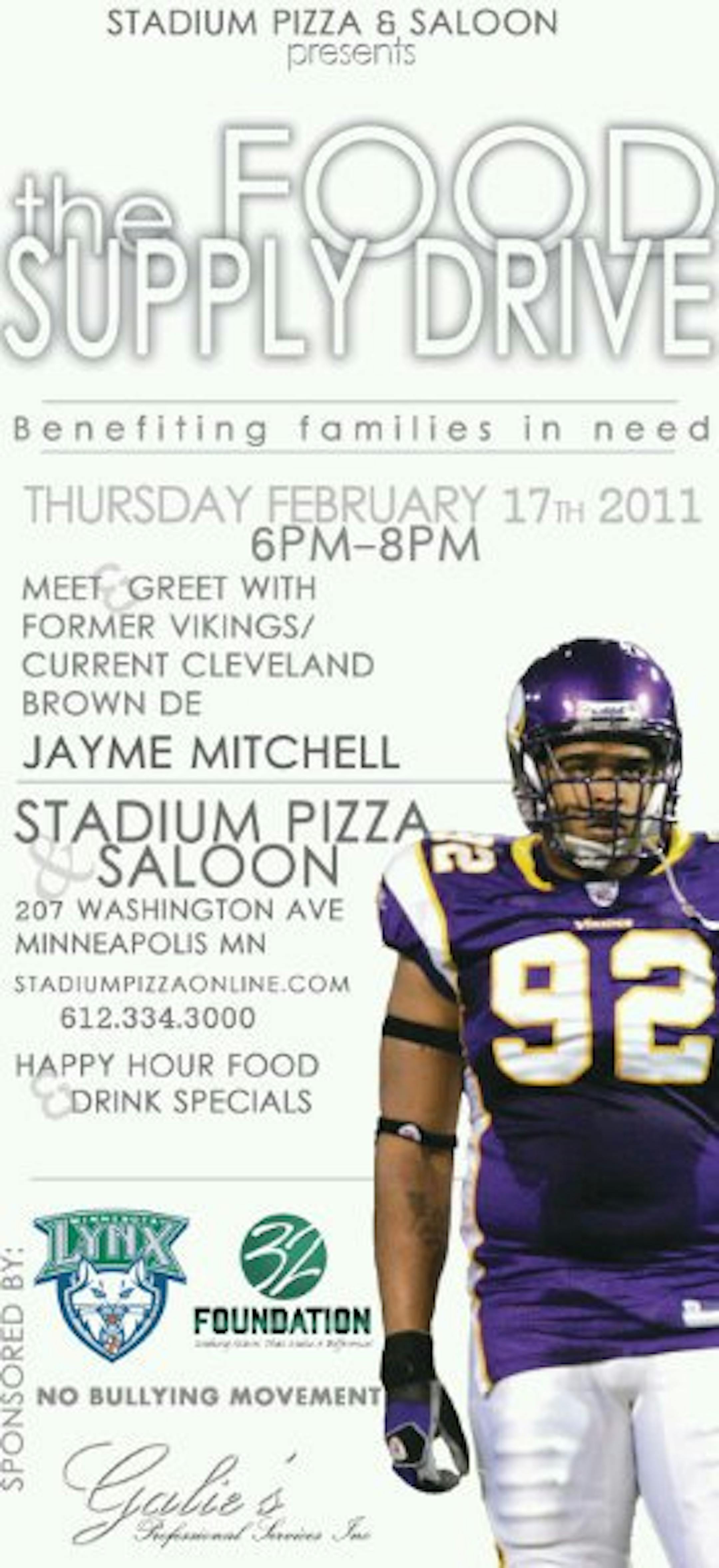 On Thursday, February 17 · 6:00pm - 8:00pm Former Vikings defensive end and current Cleveland Browns player Jayme Mitchell, and Galie Jaddunath CEO of Galie's Professional Services ask you to join them and donate at the Food Supply Drive 6:00pm - 8:00pm at Stadium Pizza & Saloon 207 Washington Avenue., Minneapolis, MN.