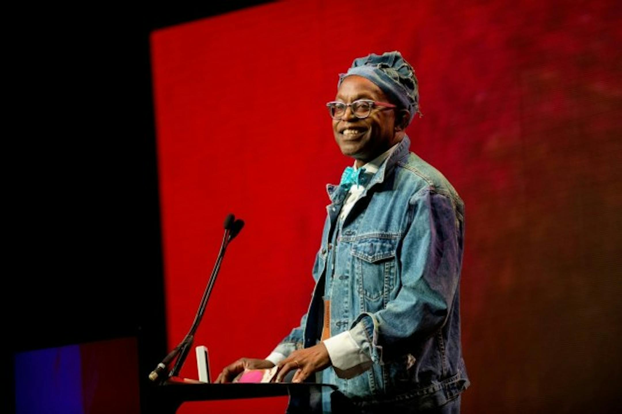 Seitu Jones accepted the $200,000 Juried Grand Prize for "The Heartside Community Meal" in Grand Rapids, Mich., on Friday. (Neil Blake/The Grand Rapids Press via AP)