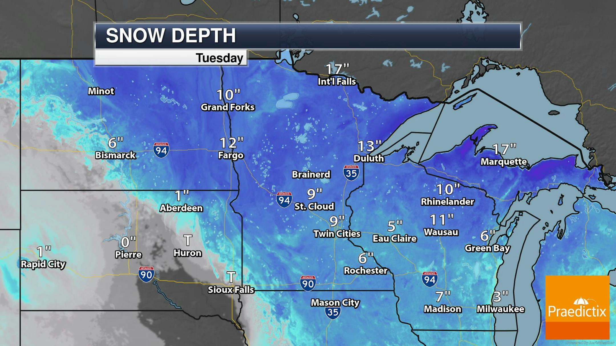 Here's a look at how much snow we've seen so far this season. Note the Twin Cities has seen nearly 33", which is nearly +5.0" above average. Grand Forks, ND has seen nearly 40" of snow, which is more than 1ft above average! Heading south into South Dakota, many locations there are below average and more than 1ft below average in Pierre and Huron. Folks in southern Wisconsin are also nearly 1ft below average, including Madison and Milwaukee.