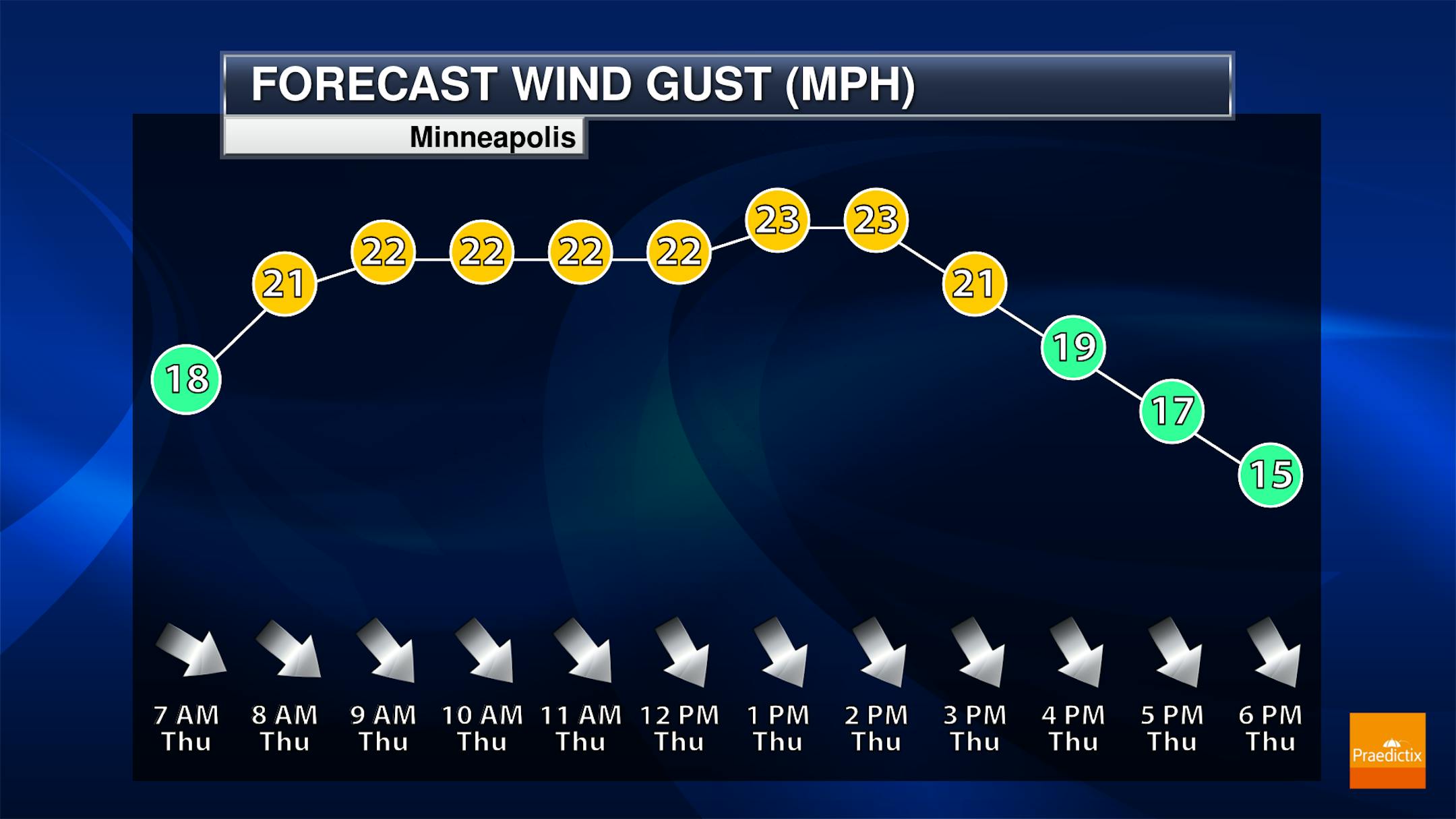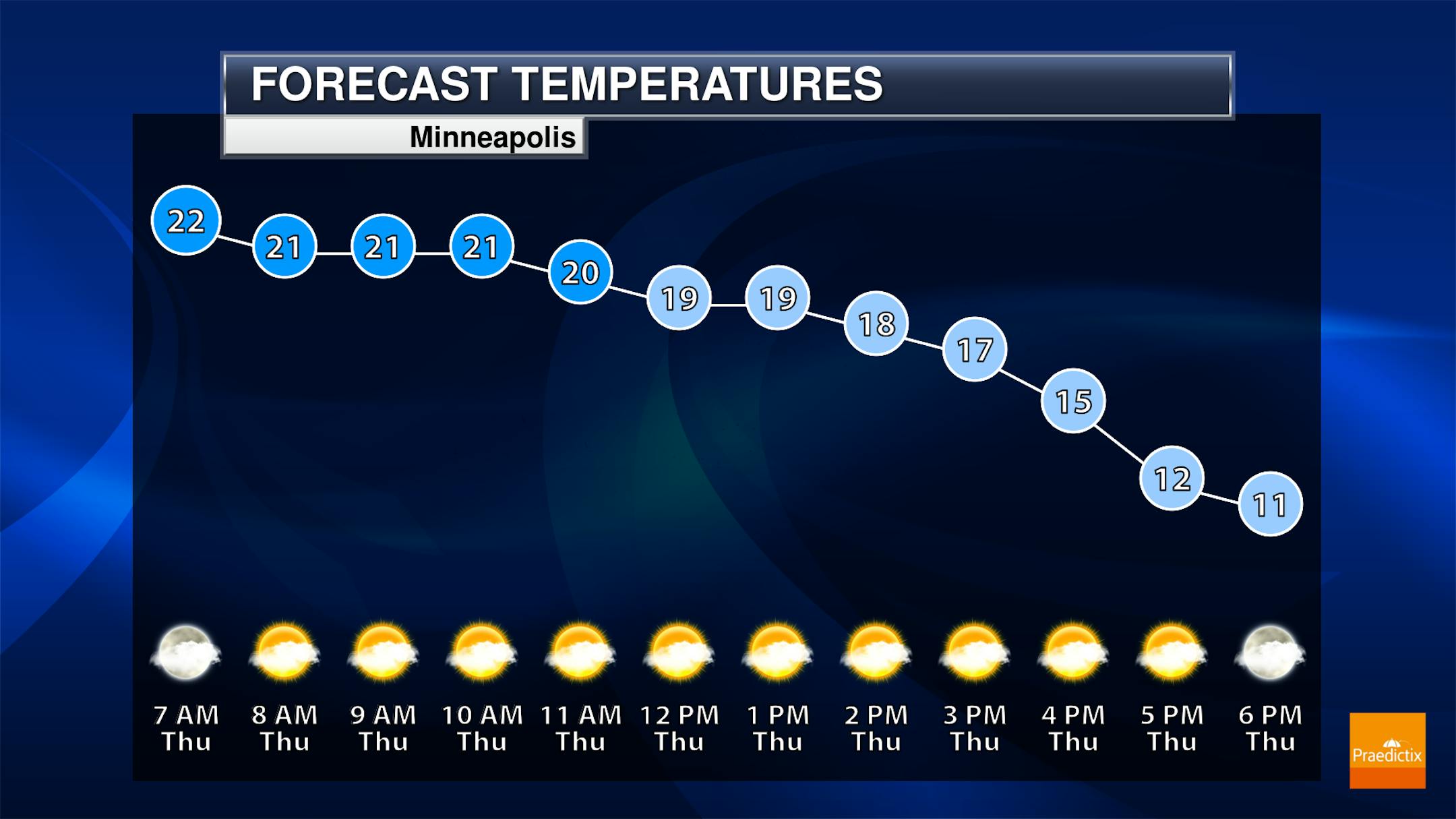 The hourly temps for Minneapolis on Thursday show temps starting in the low/mid 20s with falling temps through the day. Actual air temps will be in the lower teens by sunset. NNW winds will be a bit breezy with gusts approaching 20mph to 25mph.