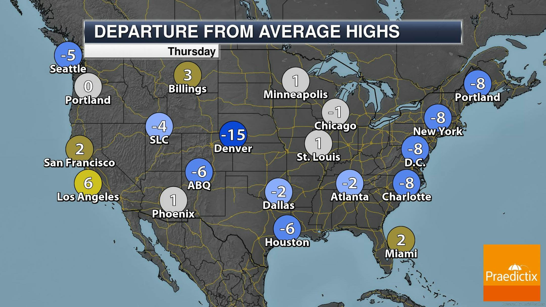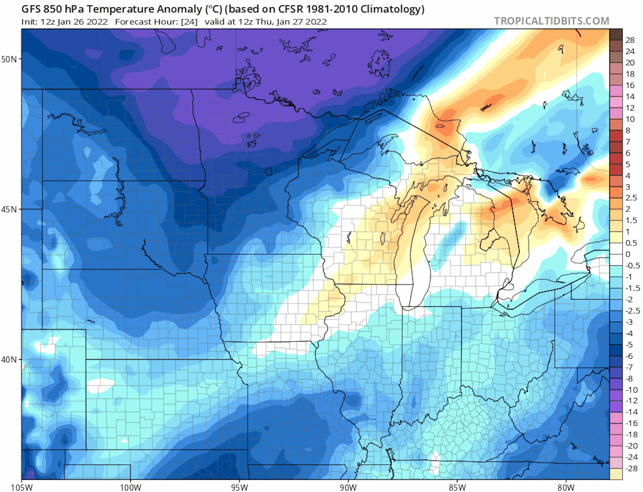 Here's the 850mb temp anomaly through the end of the week and weekend ahead. The end of the week will be quite chilly with below average temps once again. However, as we head into the weekend, warmer temps will move back in.
