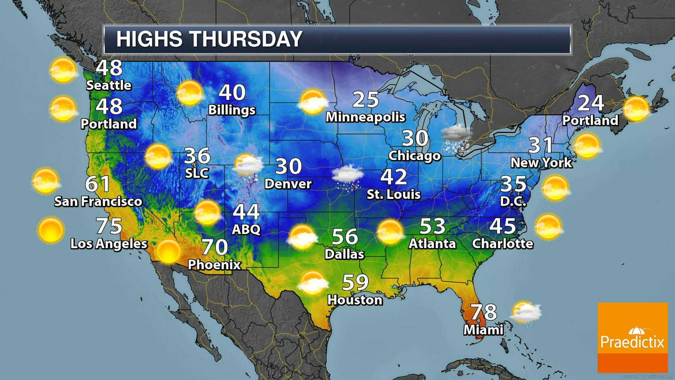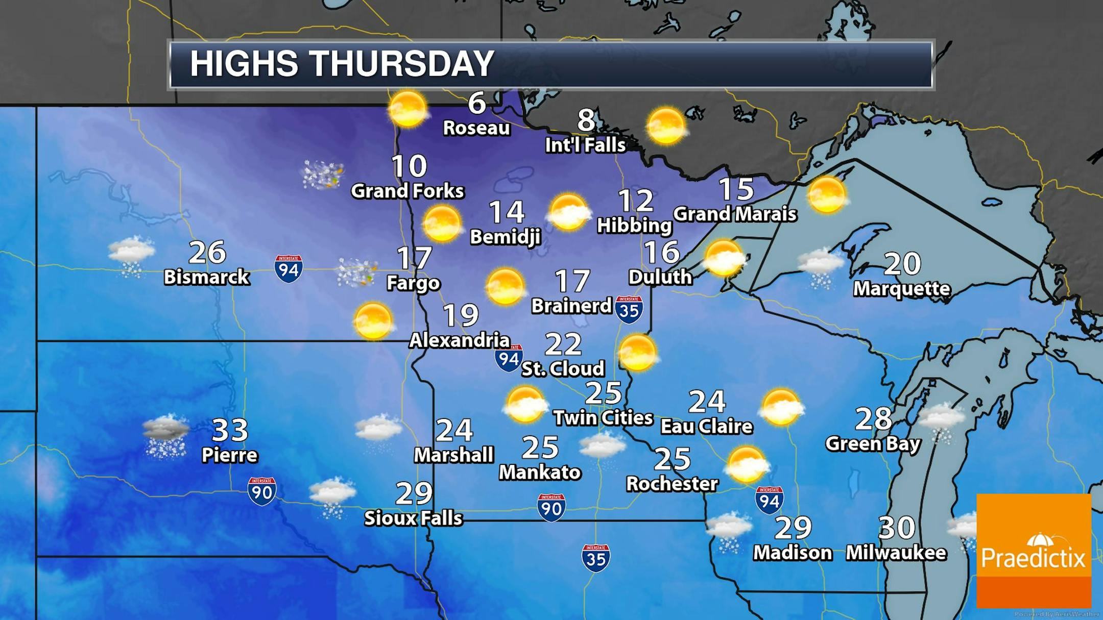 The weather outlook for Minneapolis on Thursday shows falling temps as we head through the under partly cloudy skies. NNW winds will be breezy and will make it feel more like the single digits through much of the day.
