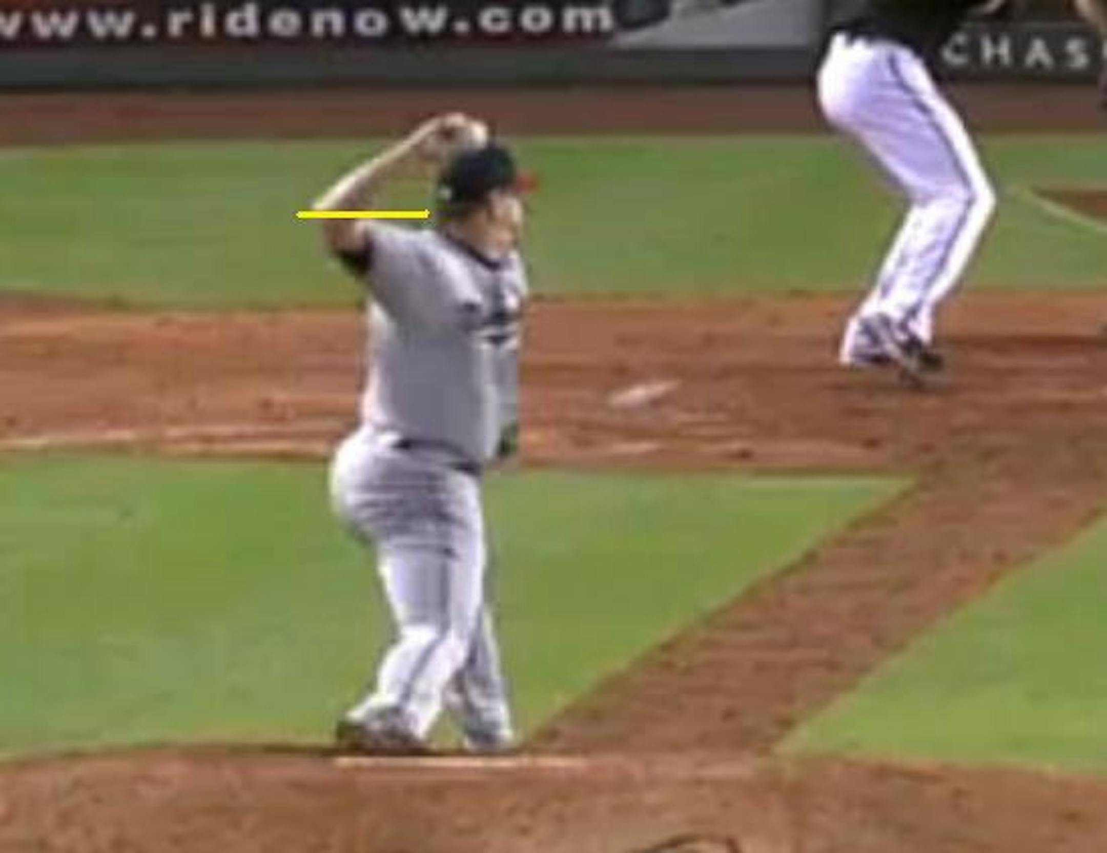 The impetus for raising the question goes beyond the recent string of rough outings. It is because Capps's motion contains what is referred to as hyperabduction of the pitching elbow. Hyperabduction occurs when a pitcher lifts his elbow above shoulder-level which places added stress on those two areas and has led to both labrum and elbow injuries. The shot below highlights this effect: