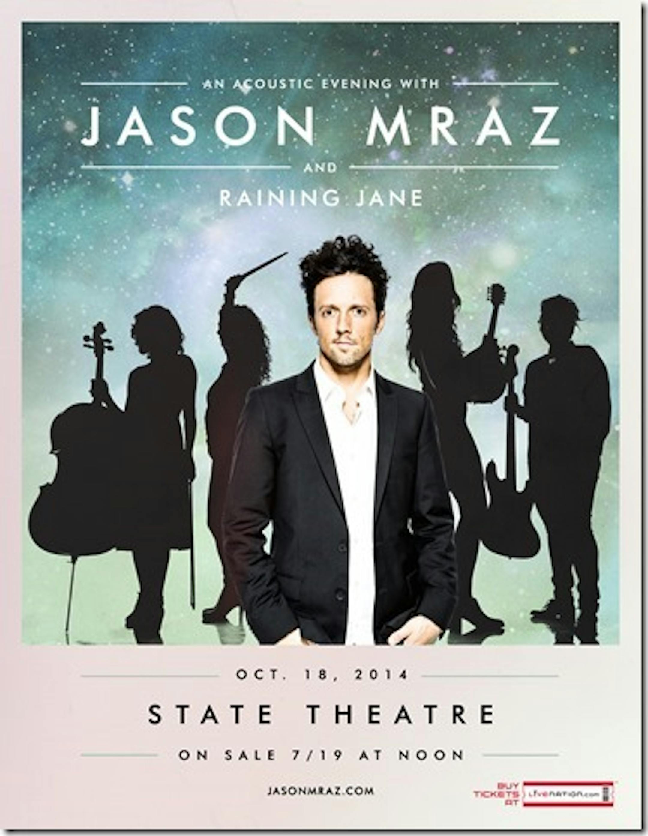 *Smiley arena-level pop/rocker Jason Mraz will promote his new album of semi-acoustic, strings-accompanied tunes in the intimate State Theatre on Oct. 18. Tickets go on sale Saturday at noon for $25-$75 through Ticketmaster. The L.A. folk-pop quartet Raining Jane will back him at shows this fall.