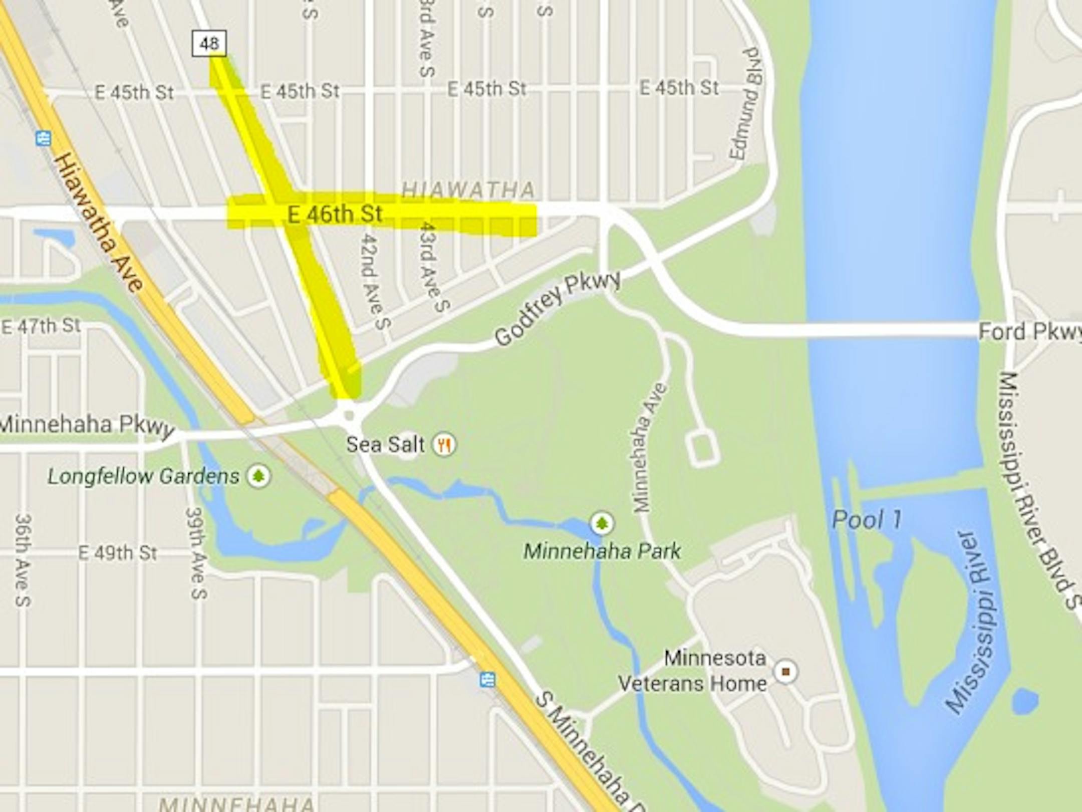 - Northbound Minnehaha Avenue: Follow eastbound Godfrey Parkway to westbound 46th Street to northbound Hiawatha Avenue to eastbound 42nd Street