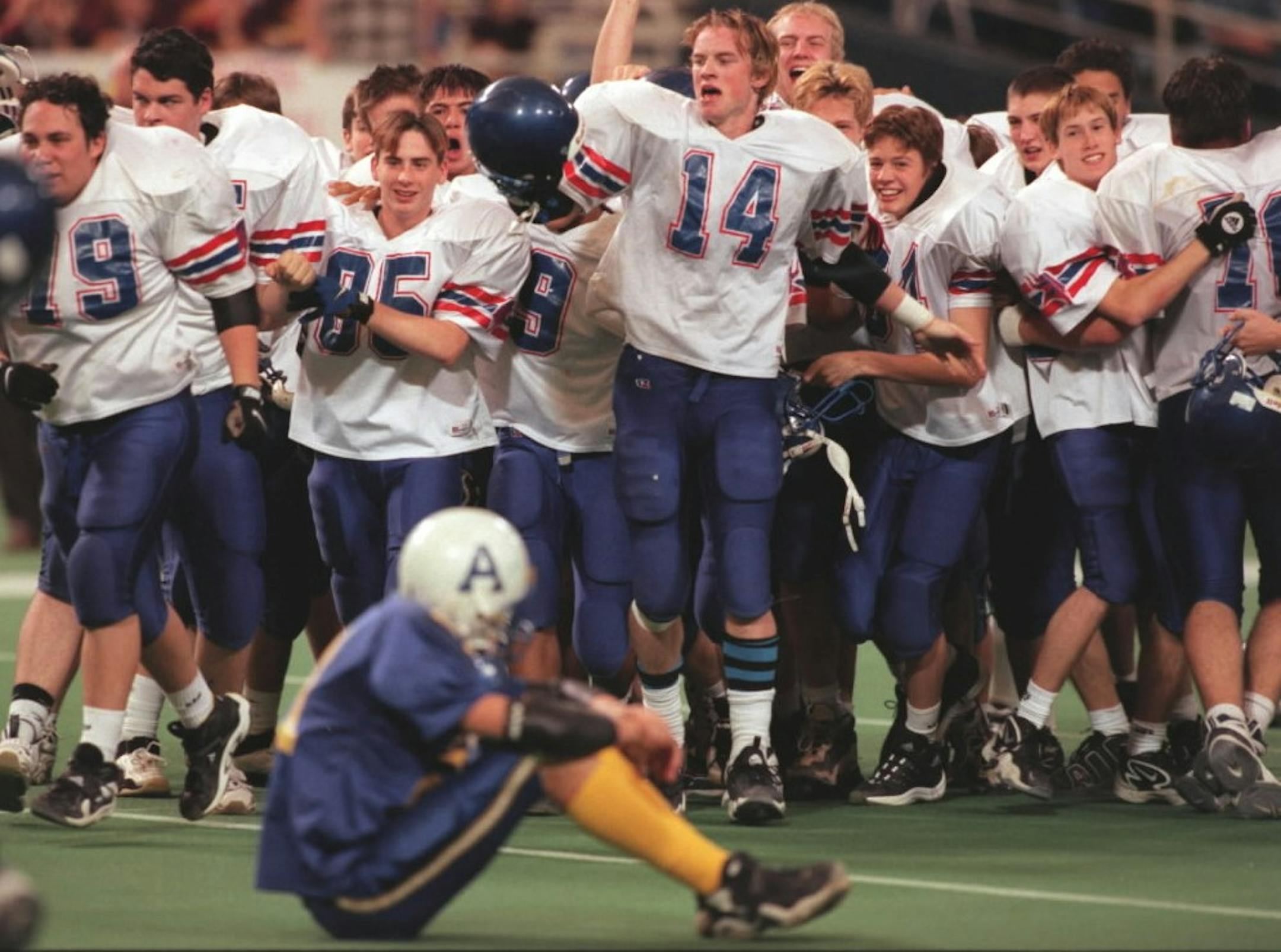 On fourth-and-goal with his team trailing by six points in the second overtime, Adrian quarterback Matt Konz hit running back Bryan Metz with a short pass over the middle. Cook County linebacker Troy Berneking met Metz in a brutal goal-line collision. When the pile was cleared, Metz was just shy of the end zone and the unbeaten Vikings had prevailed 38-32 to win their second consecutive Class 1A title. They finished 13-0.